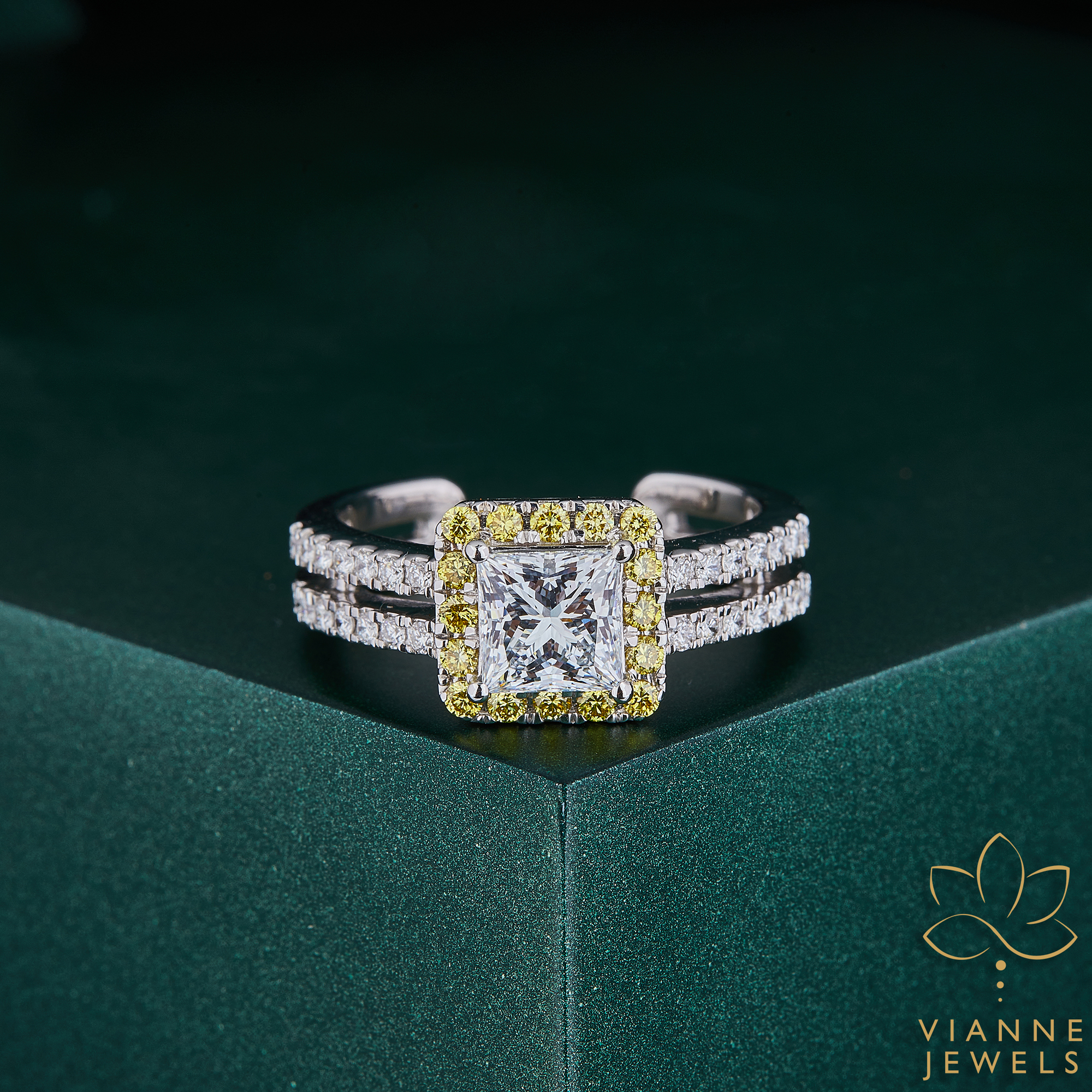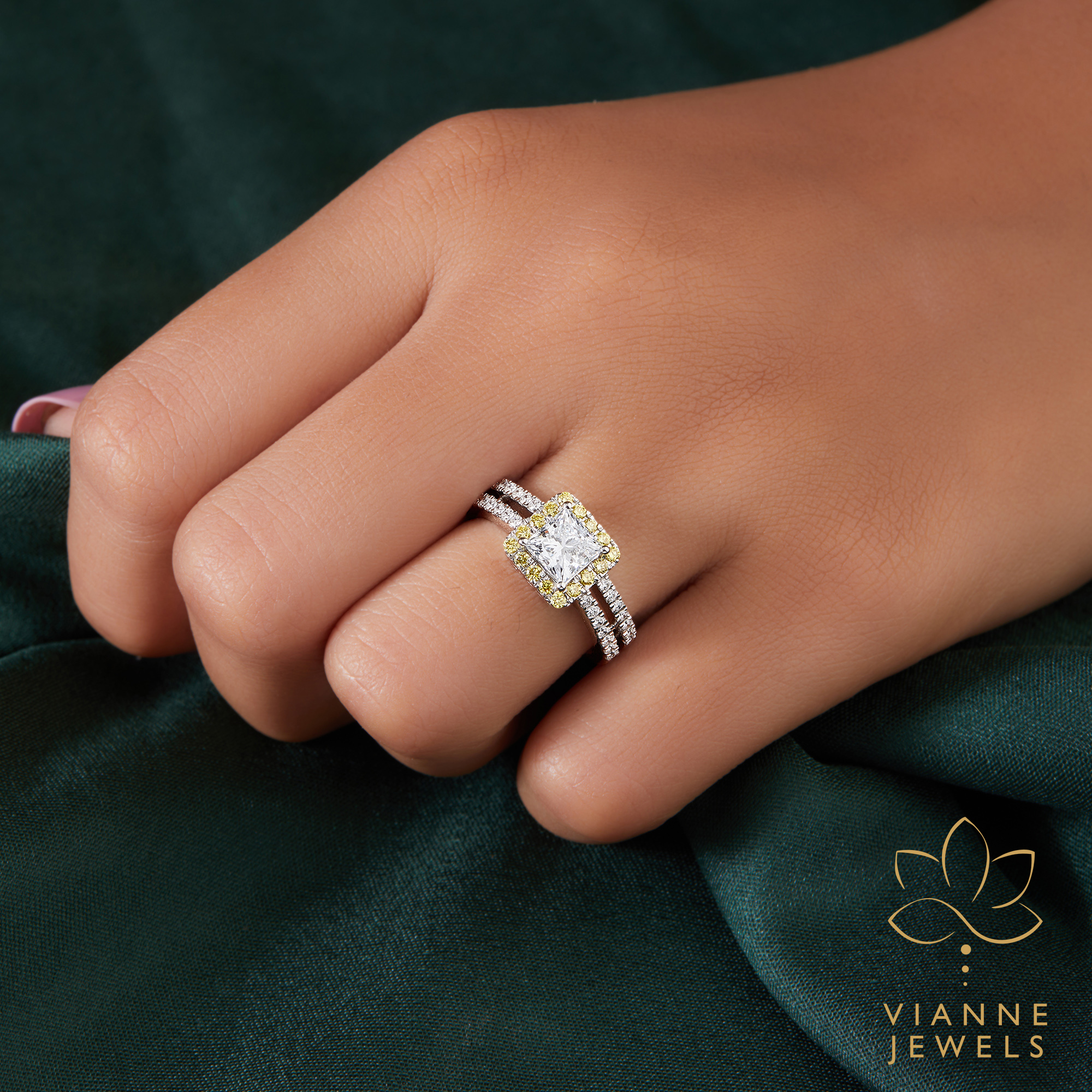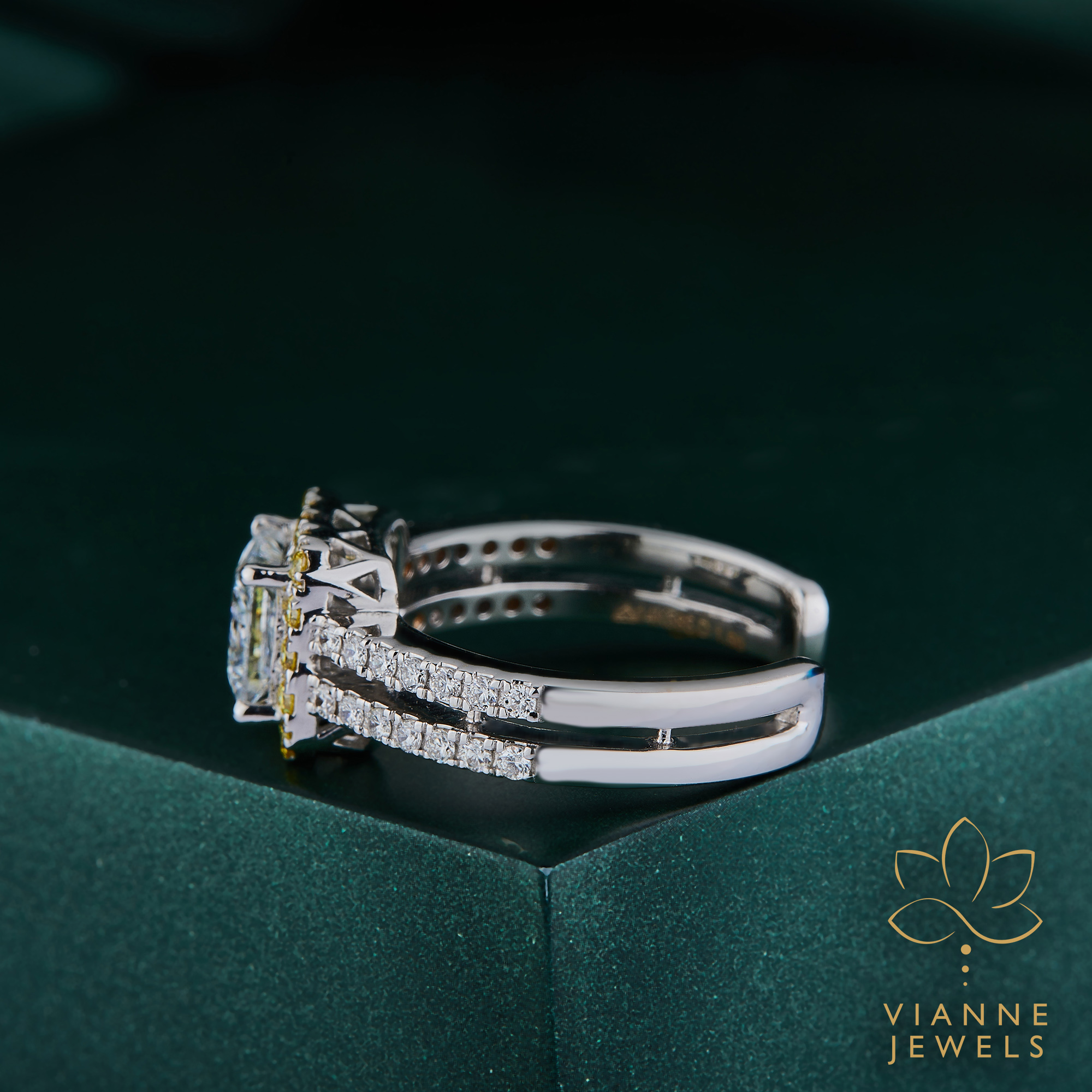 Encircling the central gem is a halo of yellow diamond accents, providing a stunning contrast that emphasizes the brilliance of the main stone. These colored diamonds add a touch of warmth and vibrancy, making the ring stand out with its delightful interplay of colors.