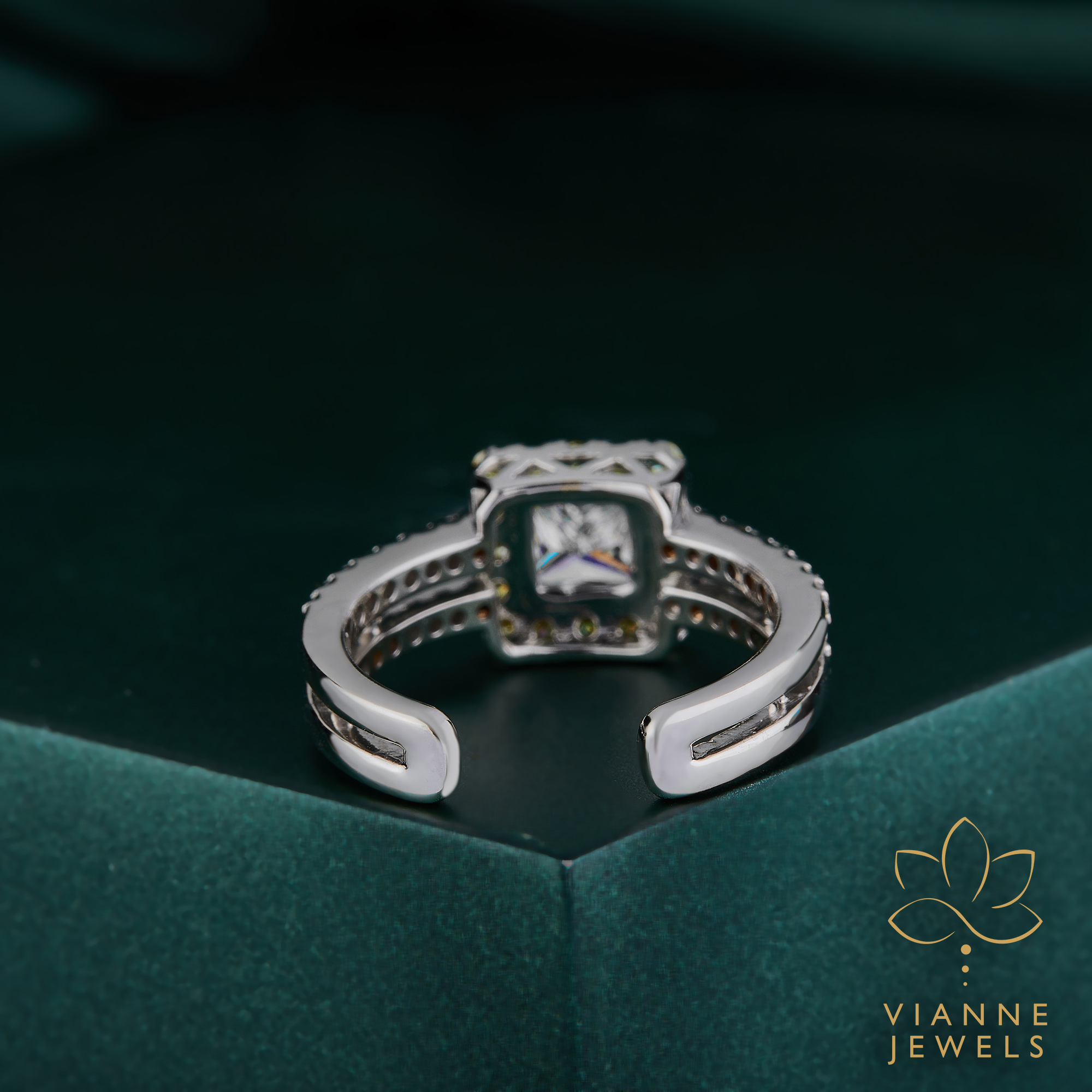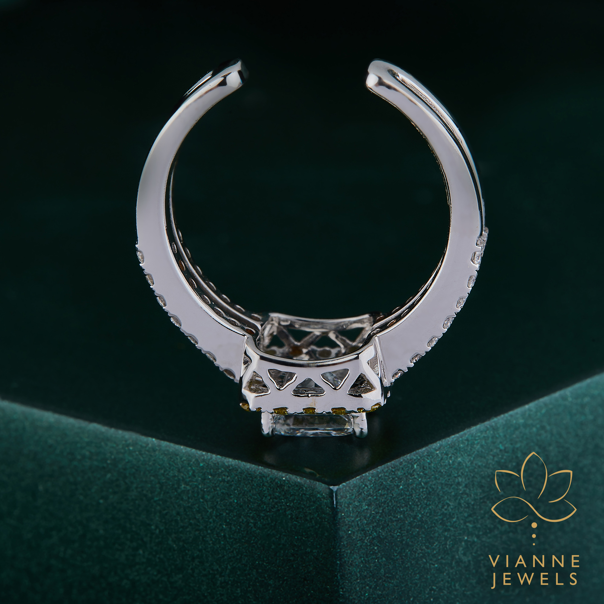 The band itself is an open cuff design, expertly crafted in lustrous white gold and adorned with a line of smaller clear lab-grown diamonds that cascade down the sides. This split band not only offers a comfortable fit but also adds a modern architectural element to the ring’s overall aesthetic.