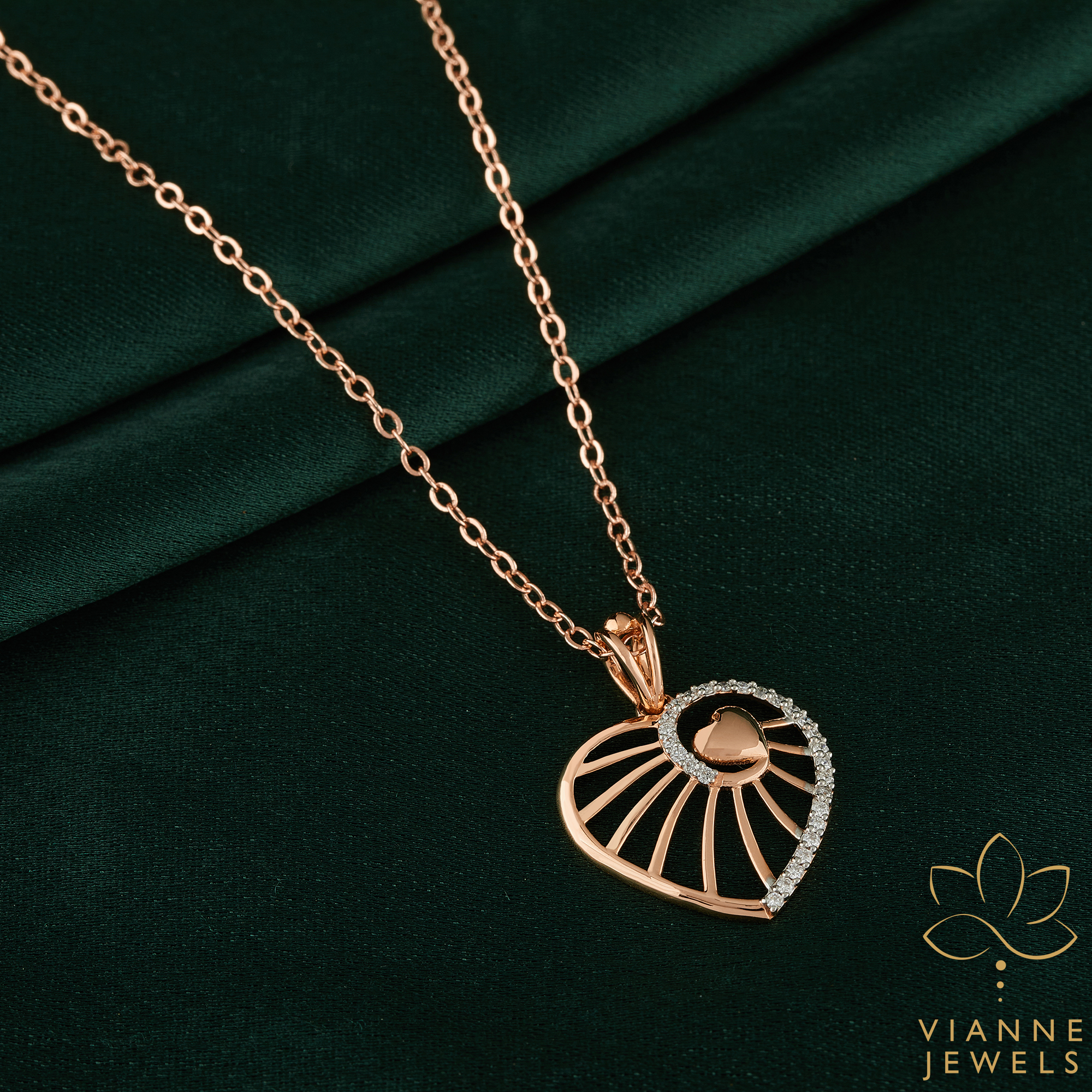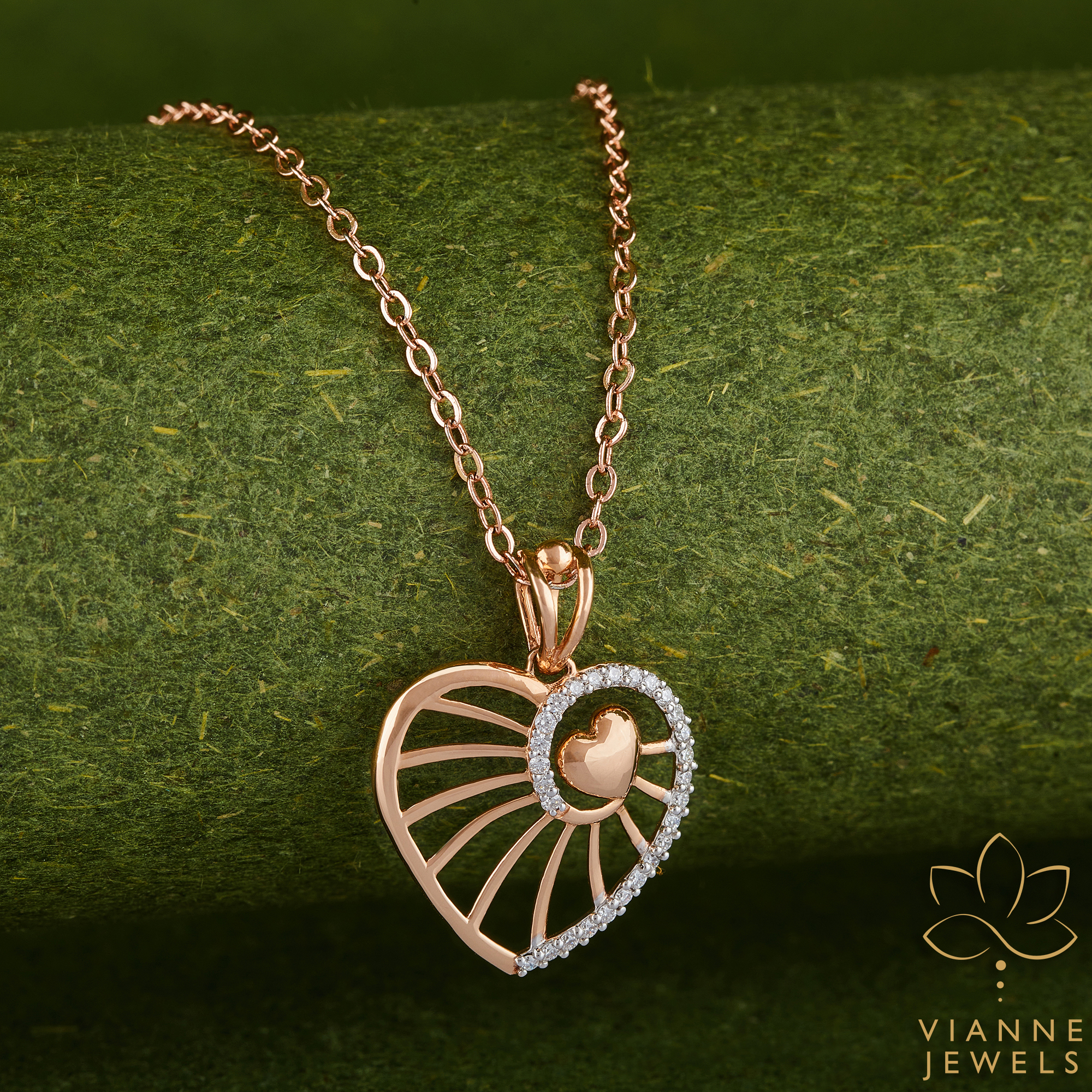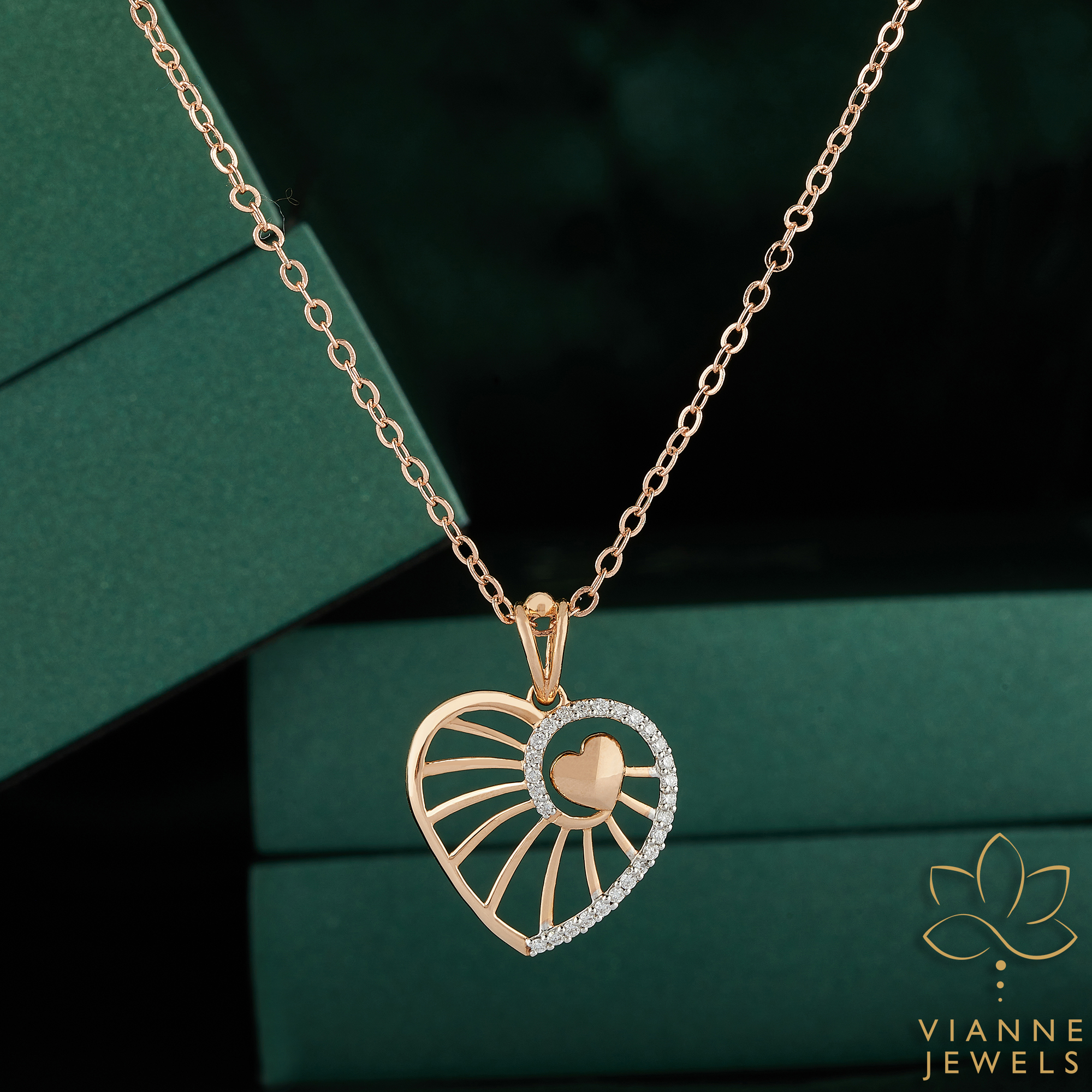 “Presenting our Radiant Affection Pendant, an exquisite piece of jewelry that captures the heart’s timeless allure. Crafted with precision, the pendant showcases a lustrous rose gold heart, its clean lines and modern design offering a fresh take on classic love symbols.