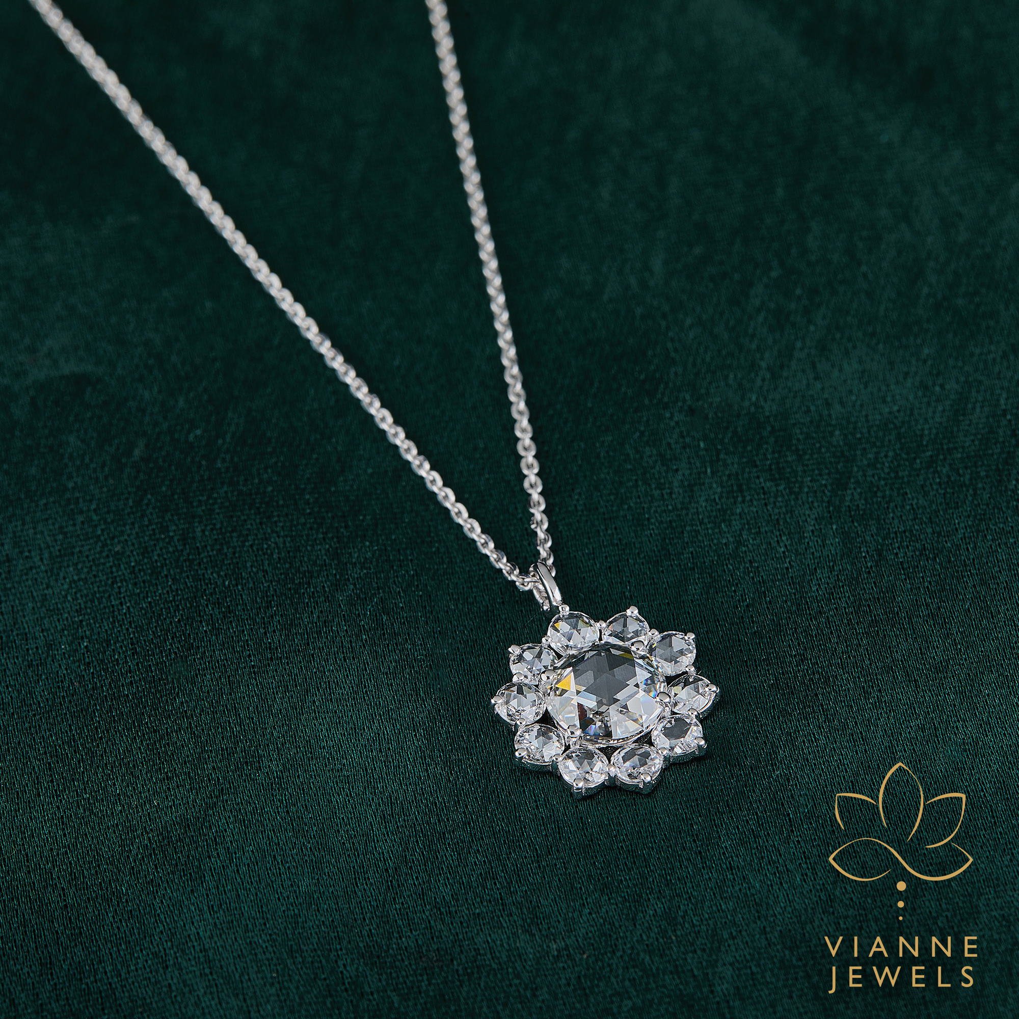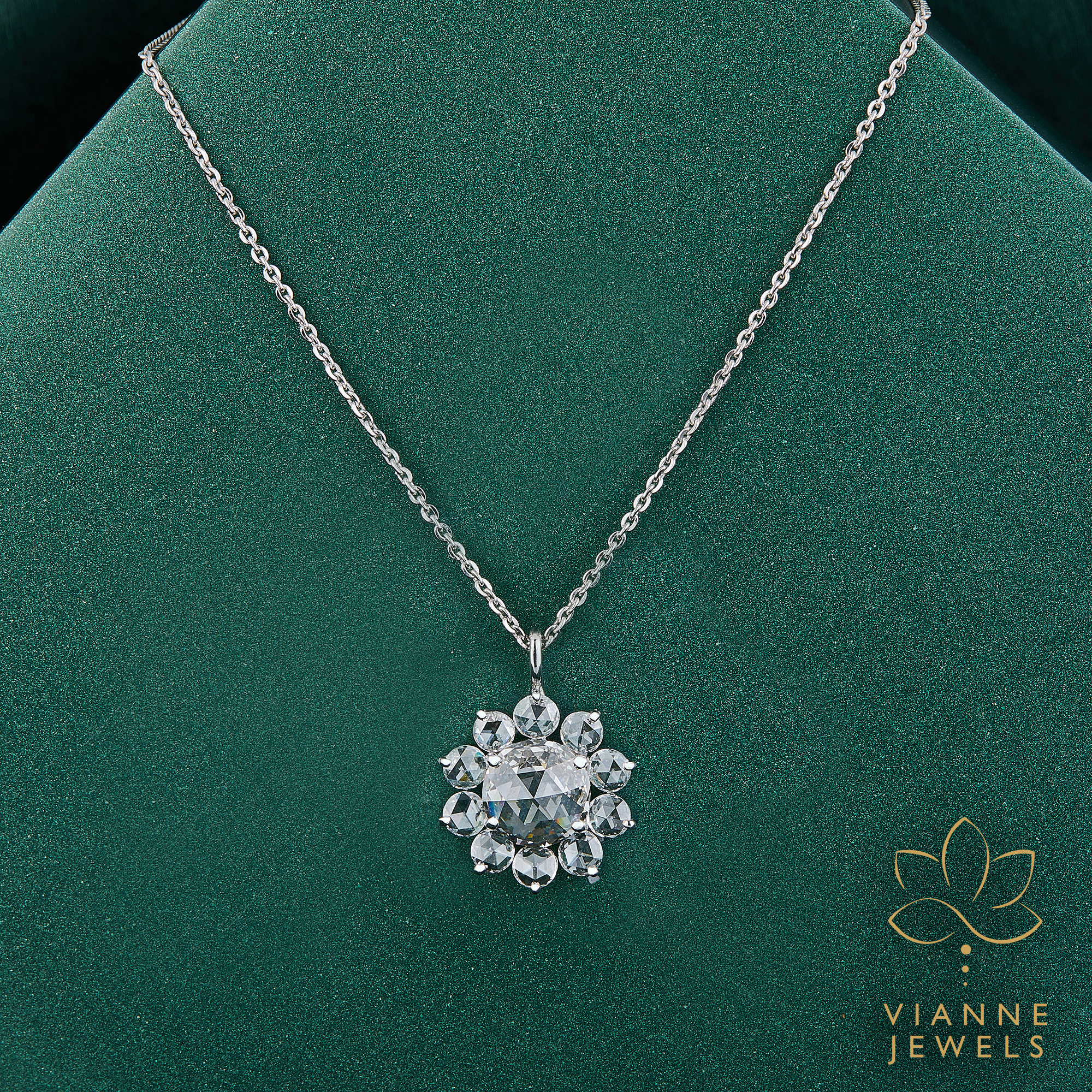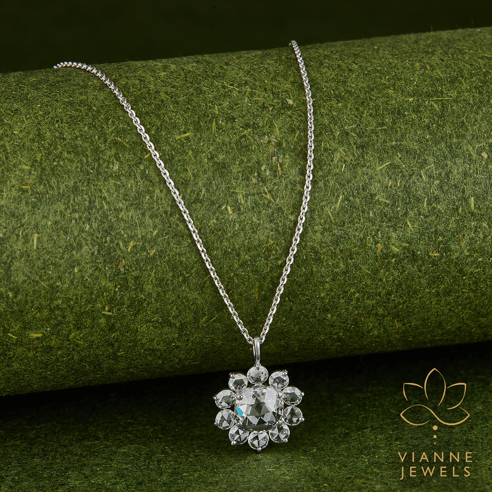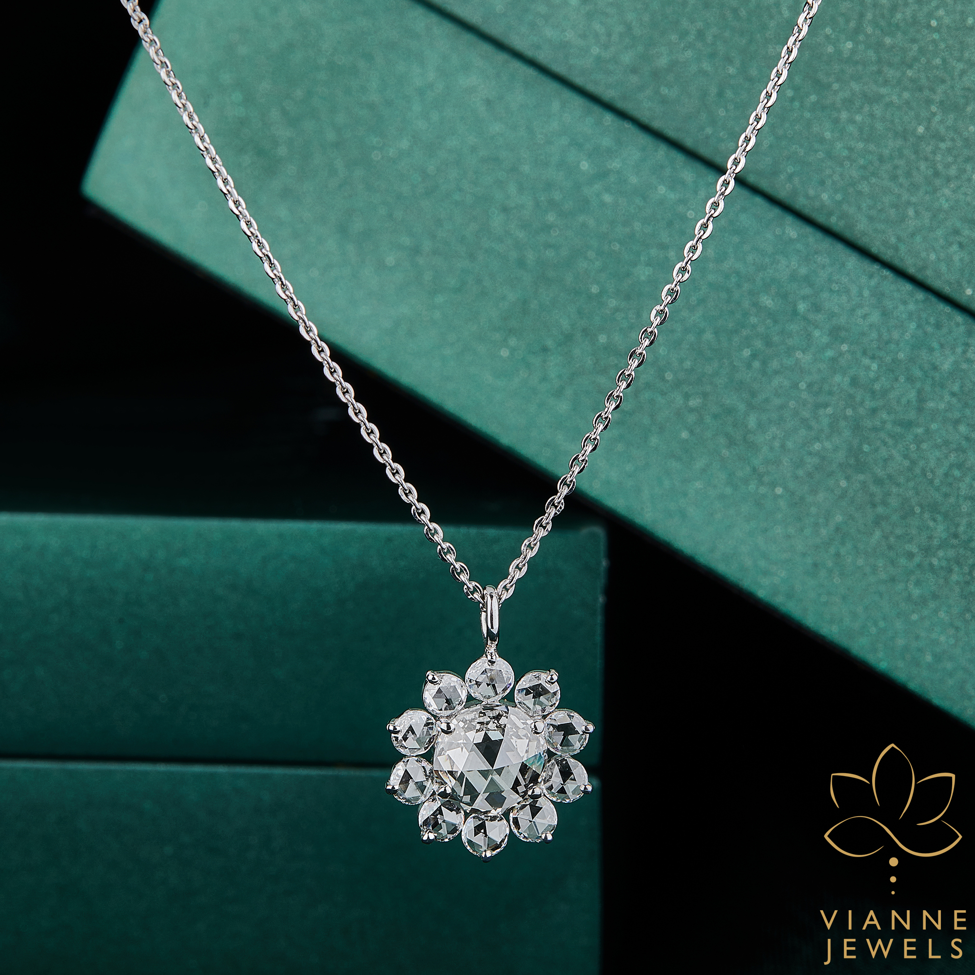 Each diamond in this pendant is lab-grown with meticulous care, offering you the brilliance and clarity of the finest natural diamonds, while being an environmentally and ethically conscious choice. The pendant’s design takes inspiration from the natural world, with the arrangement of stones resembling a flower in bloom – symbolizing growth, beauty, and the beginning of new journeys.