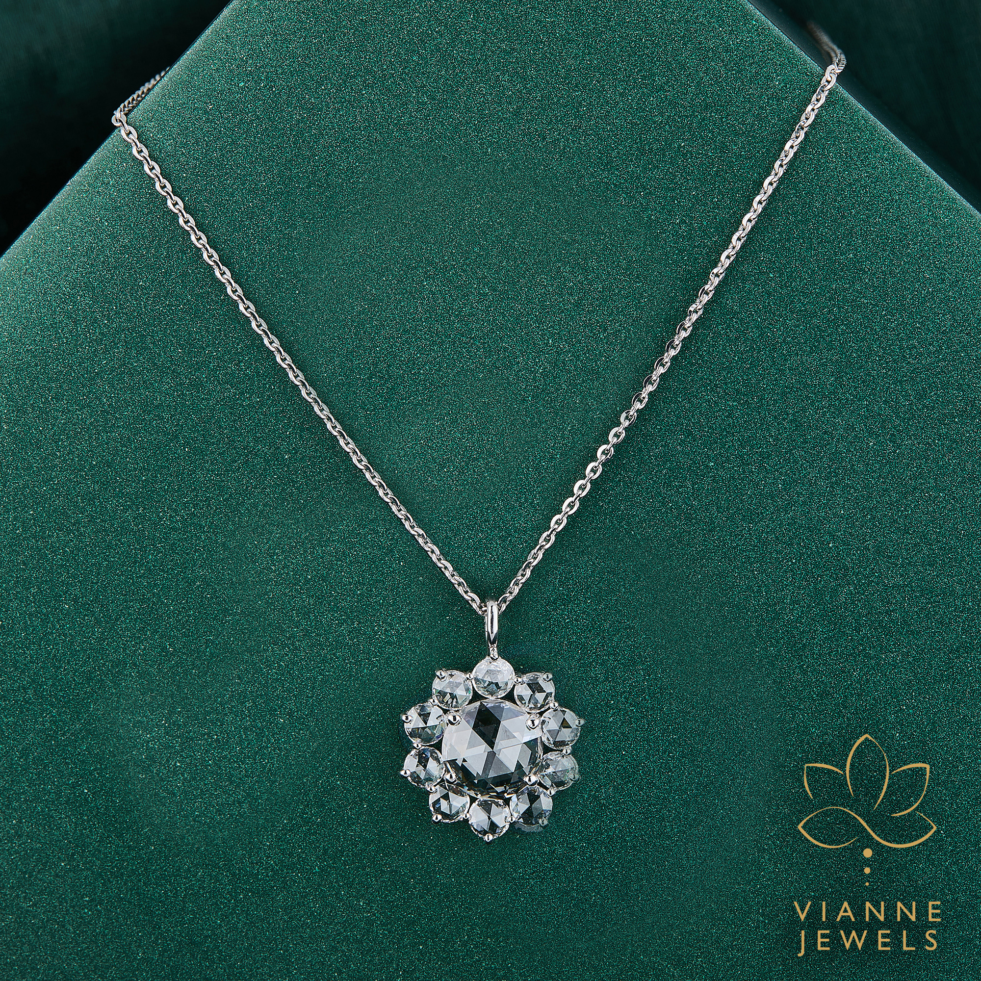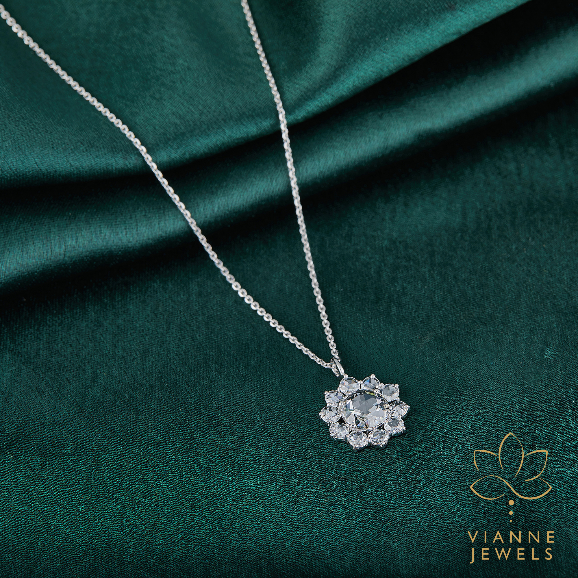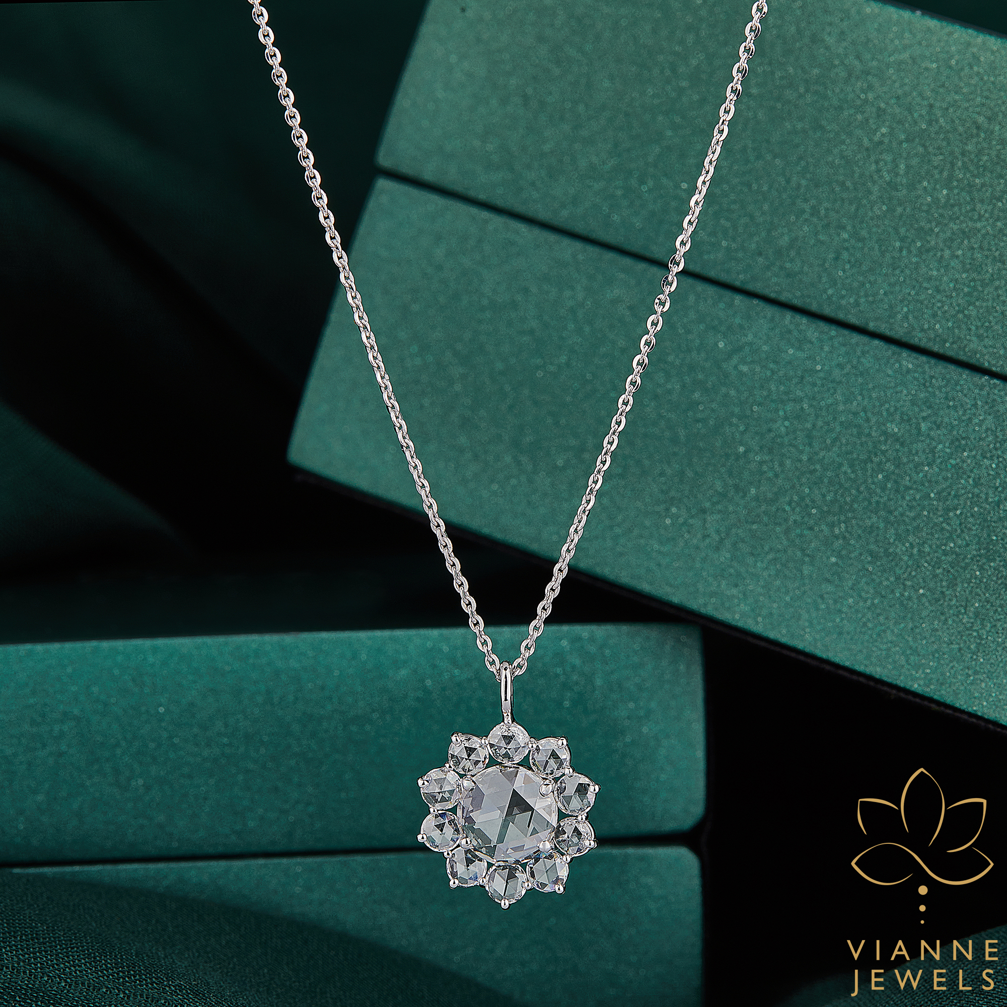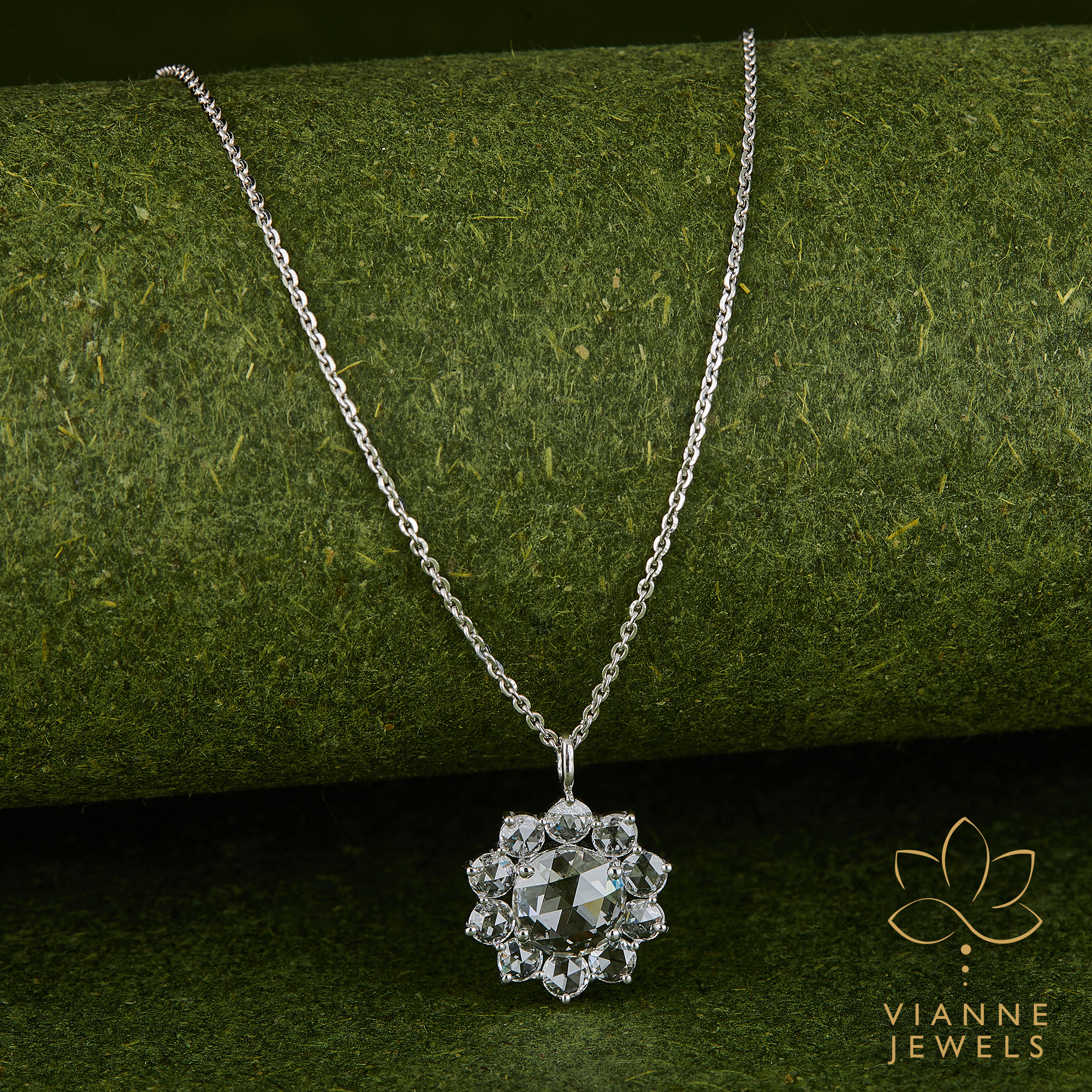 Each diamond in this pendant is lab-grown with meticulous care, offering you the brilliance and clarity of the finest natural diamonds, while being an environmentally and ethically conscious choice. The pendant’s design takes inspiration from the natural world, with the arrangement of stones resembling a flower in bloom – symbolizing growth, beauty, and the beginning of new journeys.