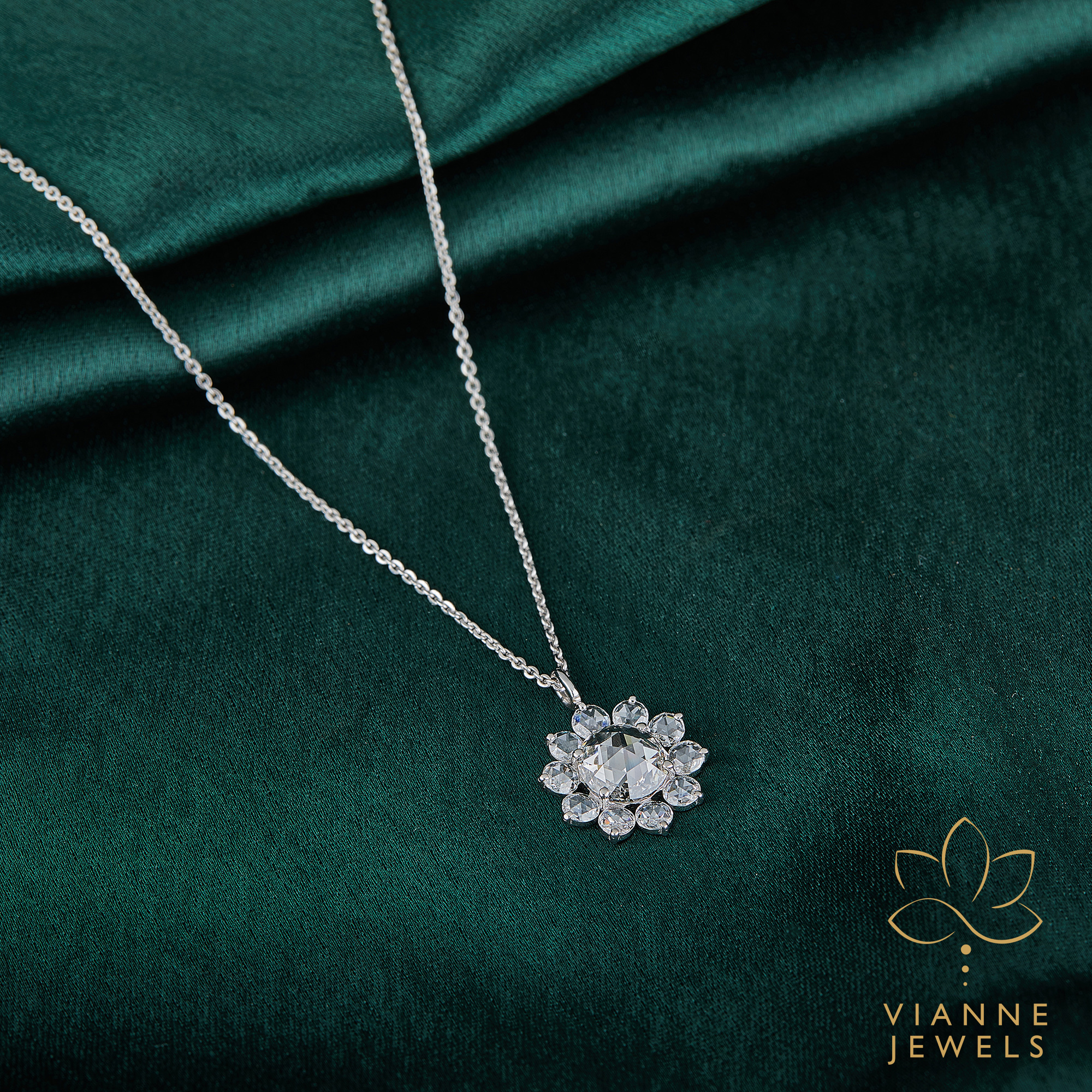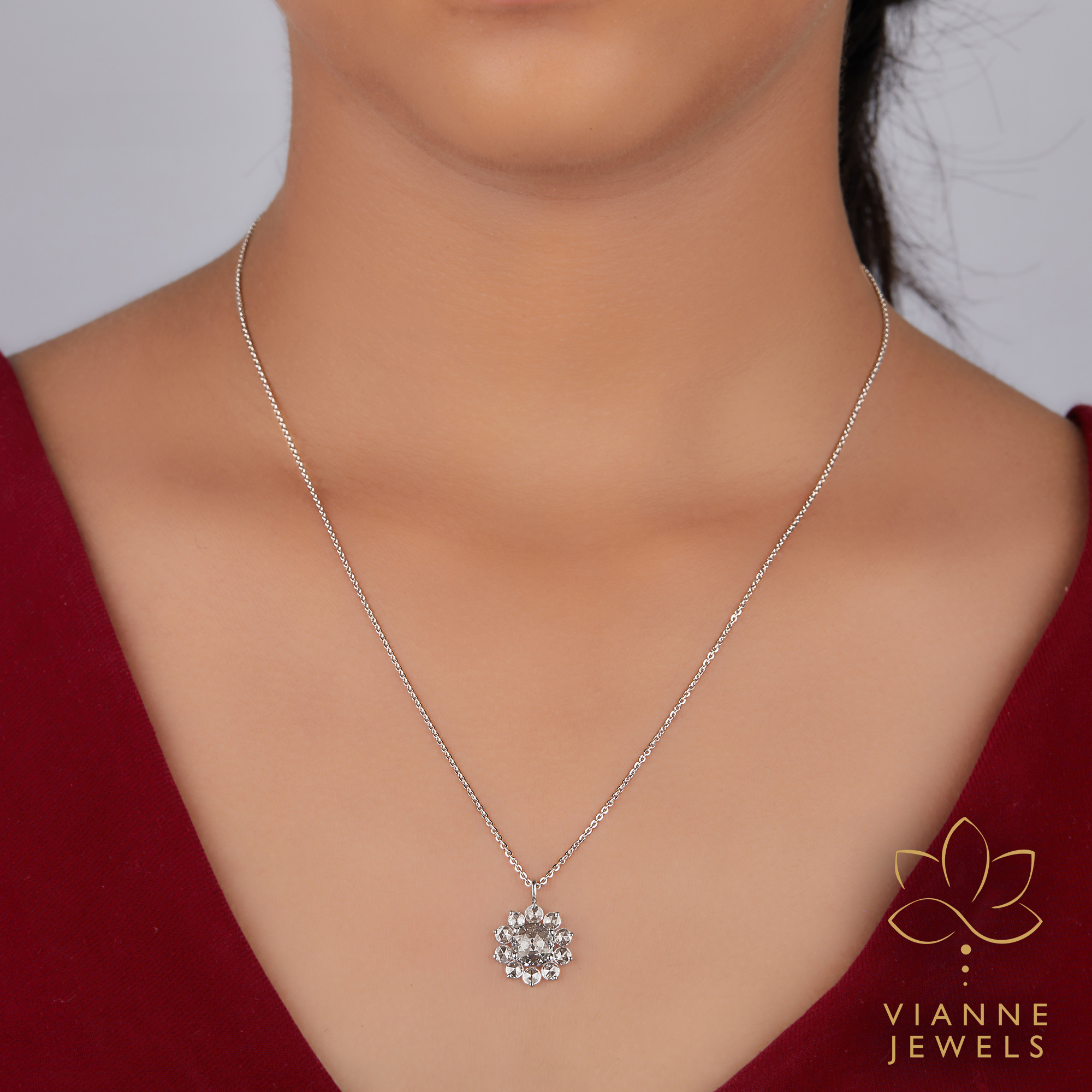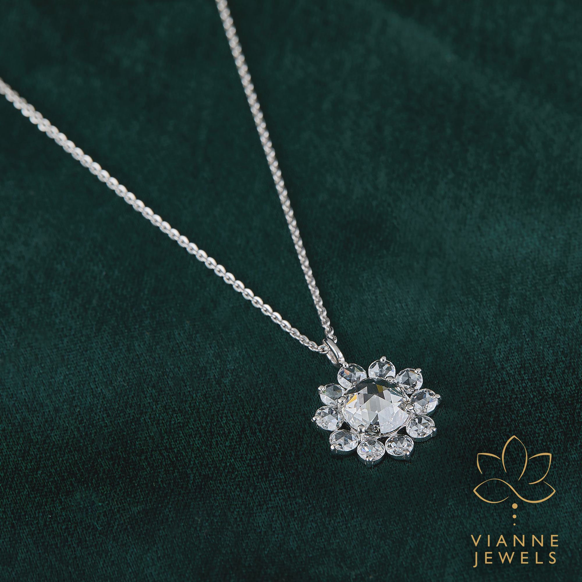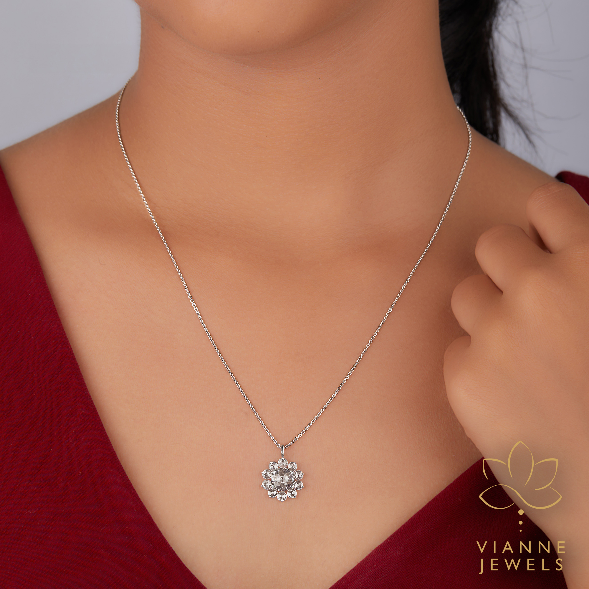 Each diamond in this pendant is lab-grown with meticulous care, offering you the brilliance and clarity of the finest natural diamonds, while being an environmentally and ethically conscious choice. The pendant’s design takes inspiration from the natural world, with the arrangement of stones resembling a flower in bloom – symbolizing growth, beauty, and the beginning of new journeys.