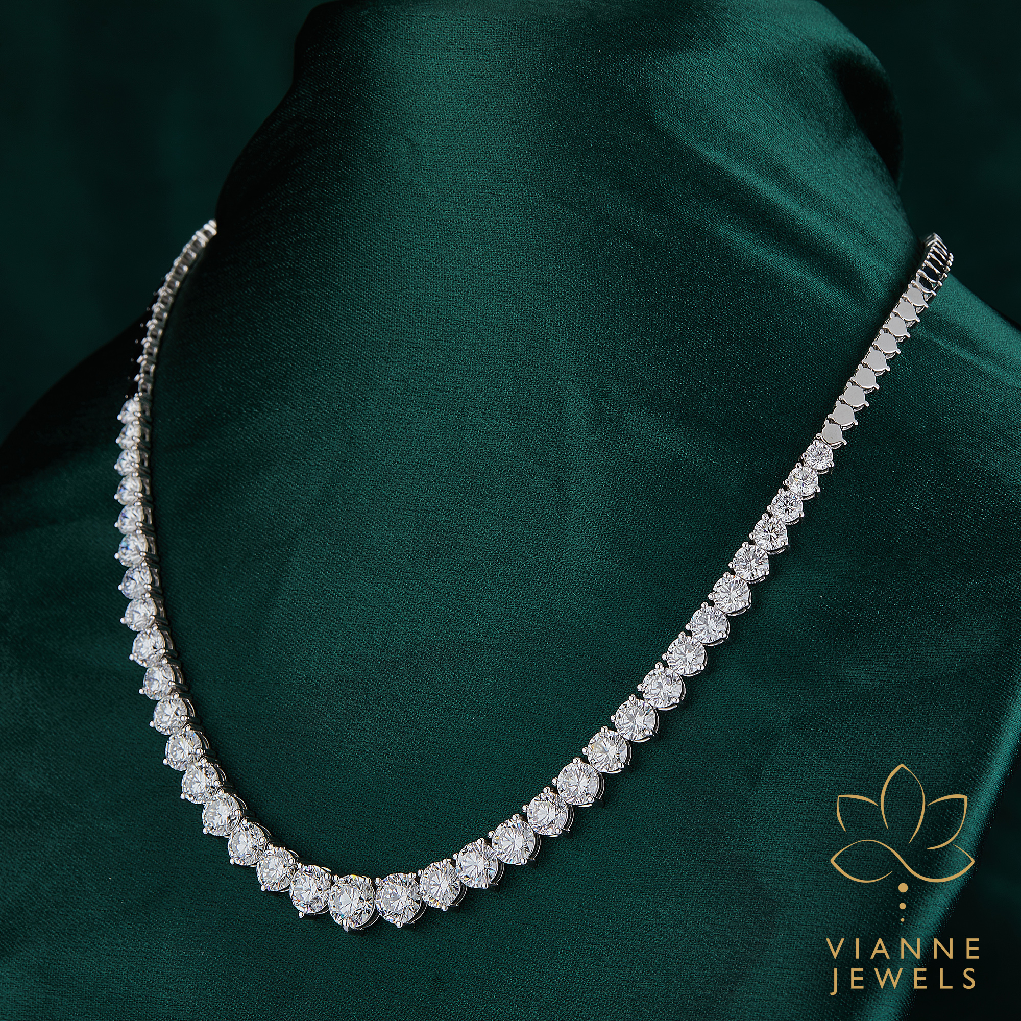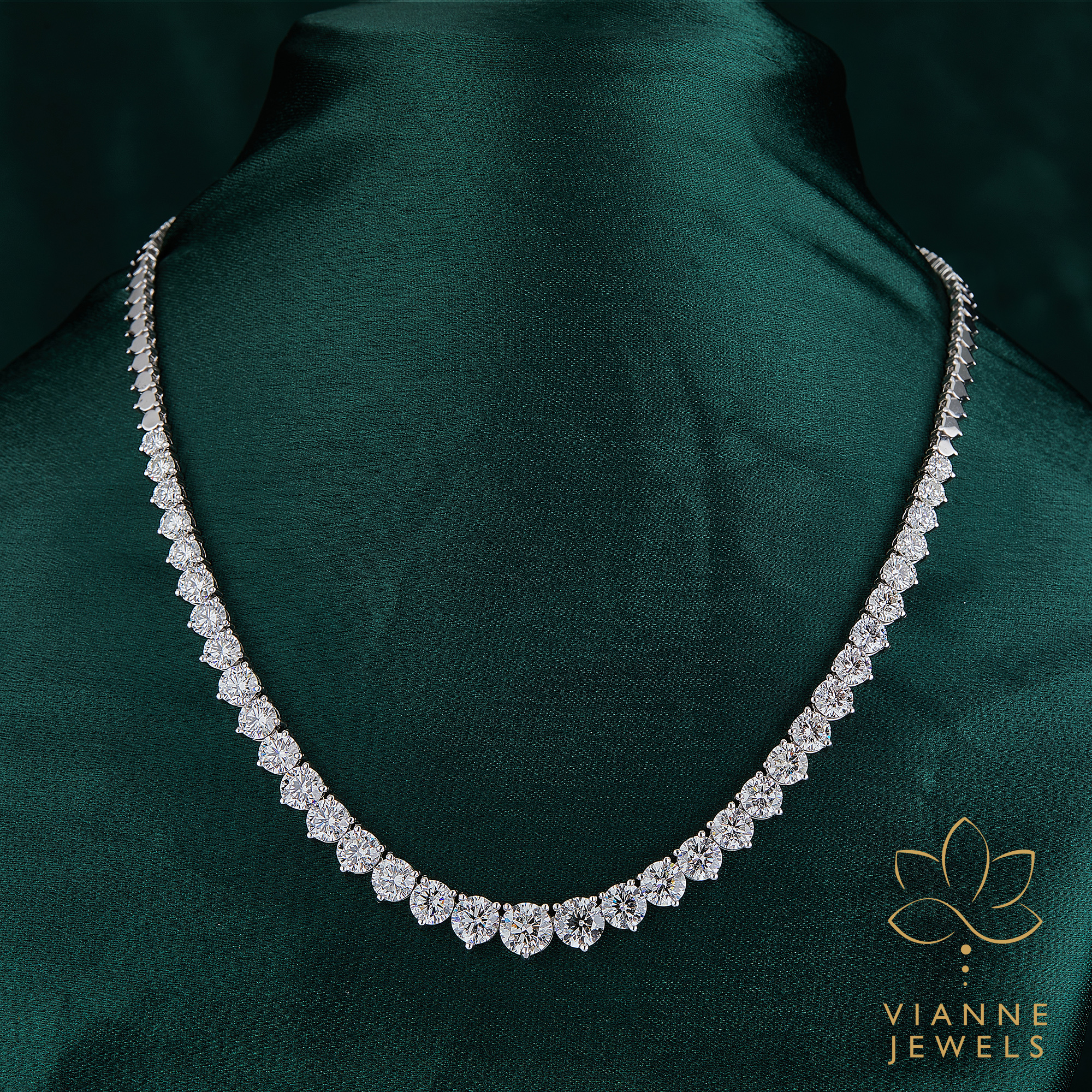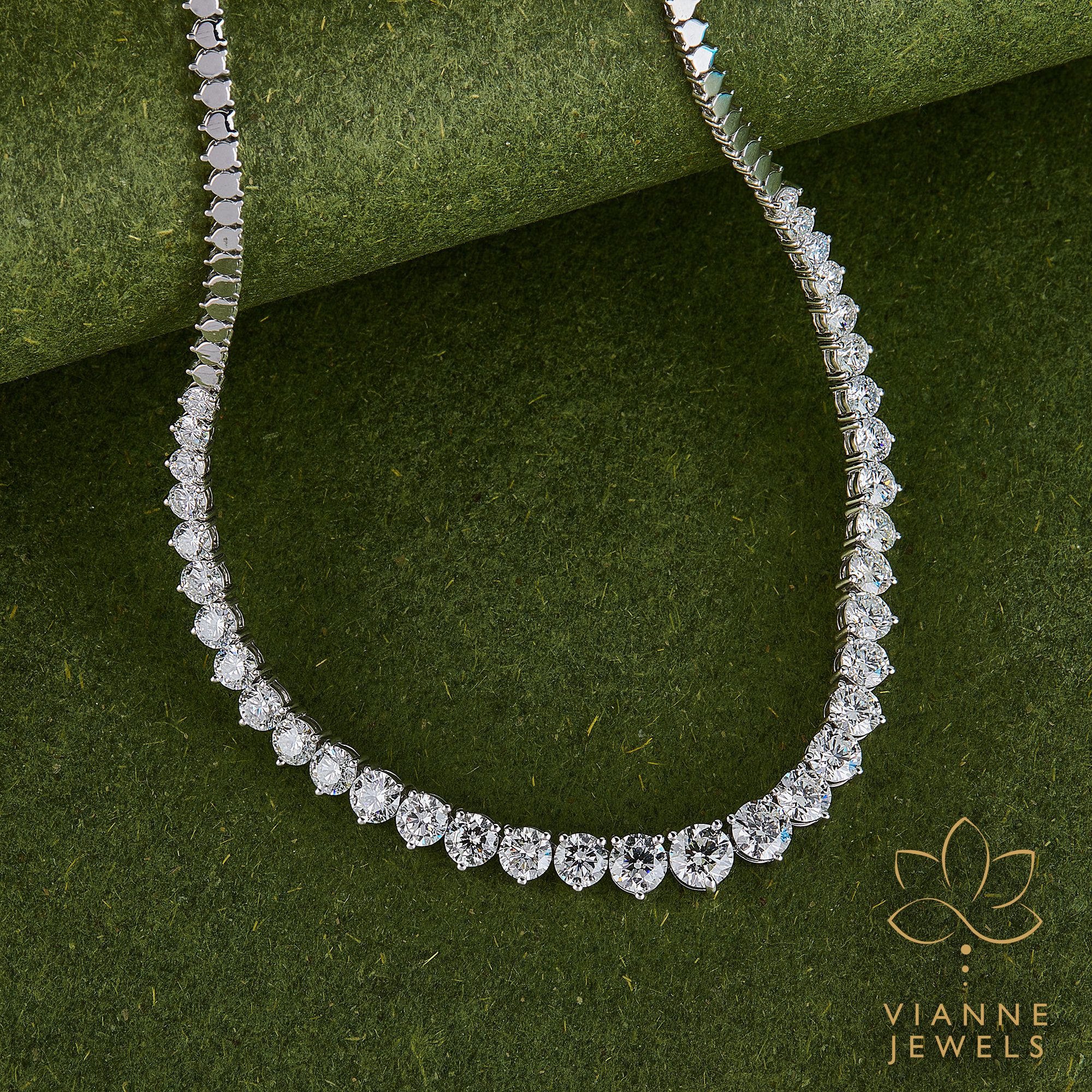 Presenting “Radiant Elegance,” a necklace that epitomizes sophistication and modern luxury. This Rivière-style masterpiece is expertly crafted in 14K white gold, featuring a stream of radiant lab-grown diamonds. Each stone is precisely cut and set to create a seamless flow of brilliance that captures and reflects light from every angle. The lab-grown diamonds offer not only exceptional clarity and color but also an ethical and sustainable alternative to mined diamonds. This necklace represents the pinnacle of craftsmanship and ethical luxury, making it the perfect statement piece for eco-conscious fashionistas. With its timeless design and ethical appeal, “Radiant Elegance” is more than an accessory—it’s a testament to the beauty of innovation and responsibility. Whether for a black-tie event or an elegant dinner, this necklace will leave a lasting impression of refined taste and conscious choice.