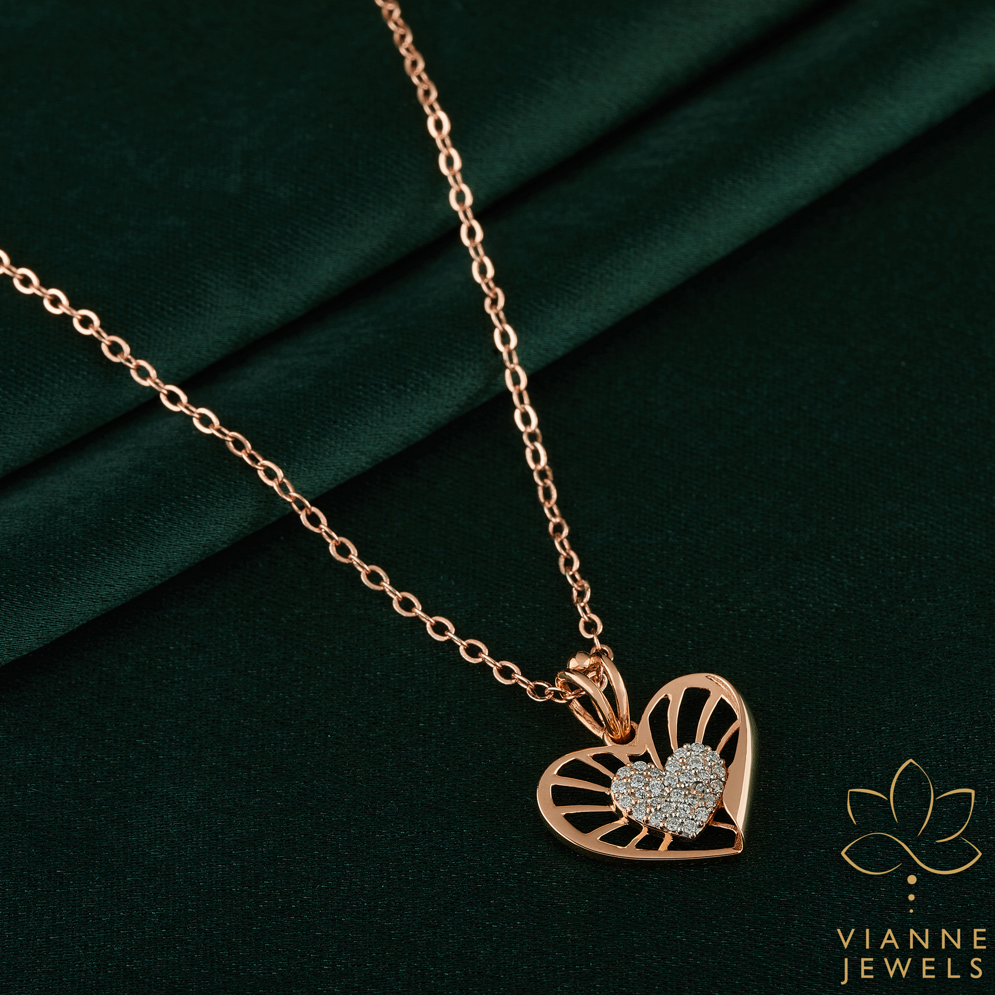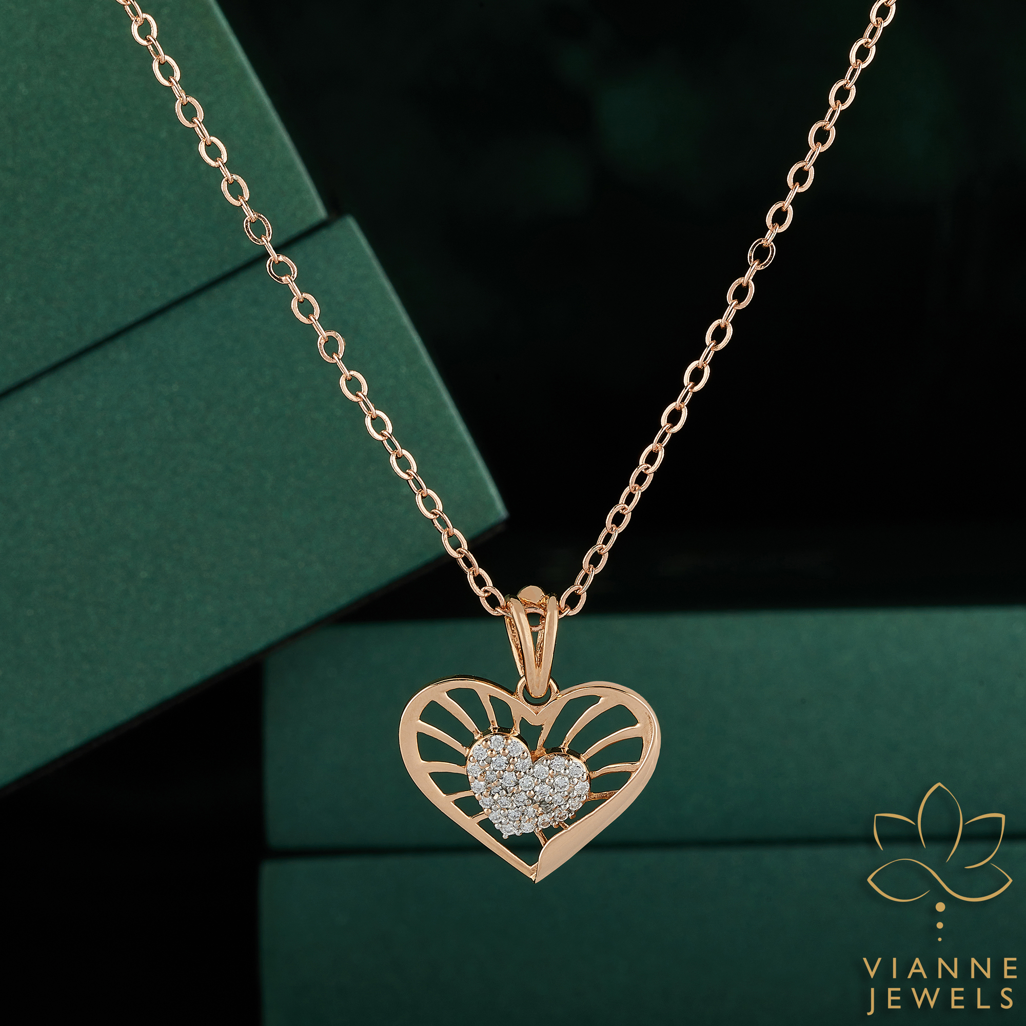 “Discover the beauty of love with our ‘Radiant Embrace’ Pendant, featuring a sleek rose gold heart with a nestled diamond center, offering an embrace of brilliance.”