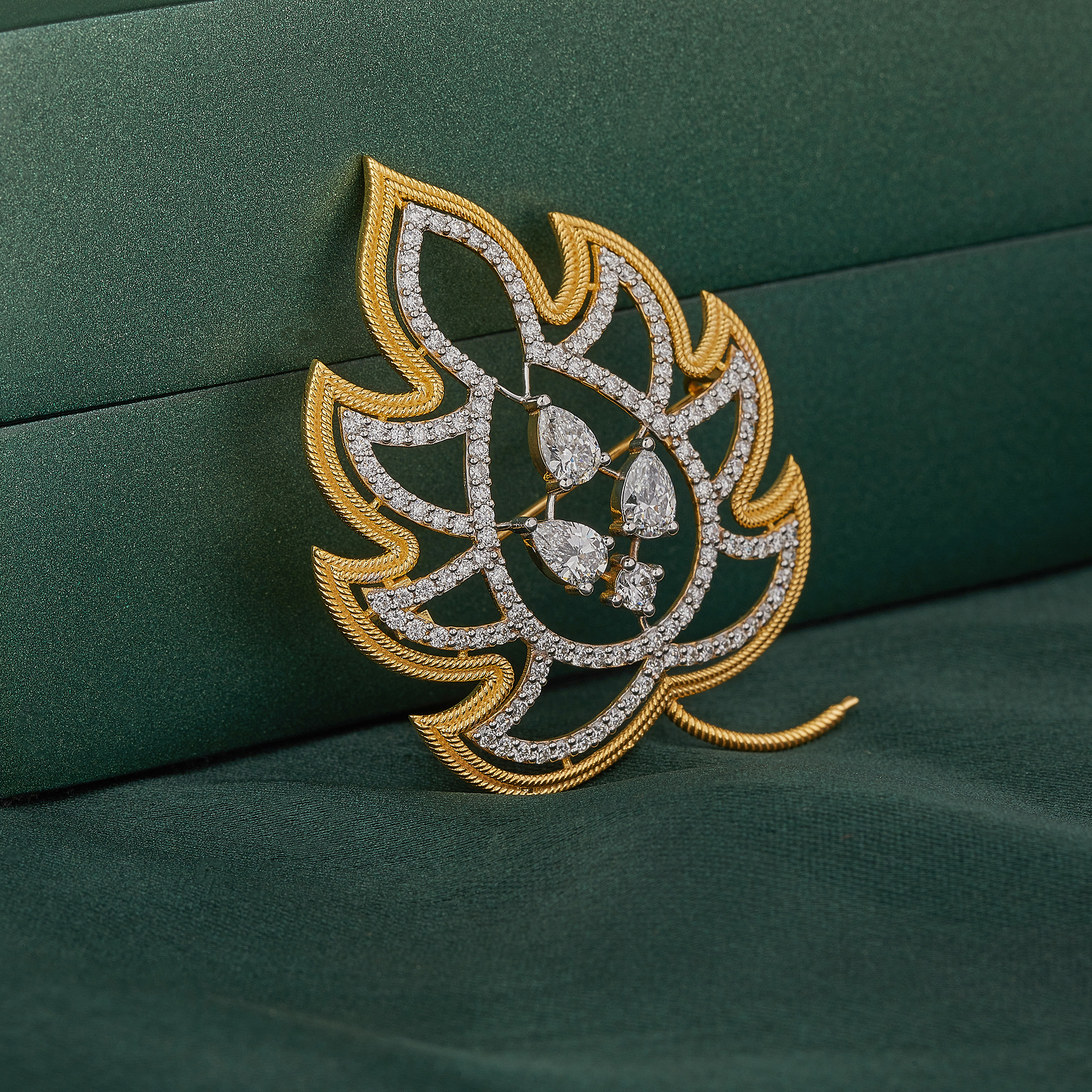 - Masterful Craftsmanship: Cast in lustrous 18K gold, the brooch showcases a detailed lotus leaf design, with textured gold edges that evoke the natural veins of a leaf.