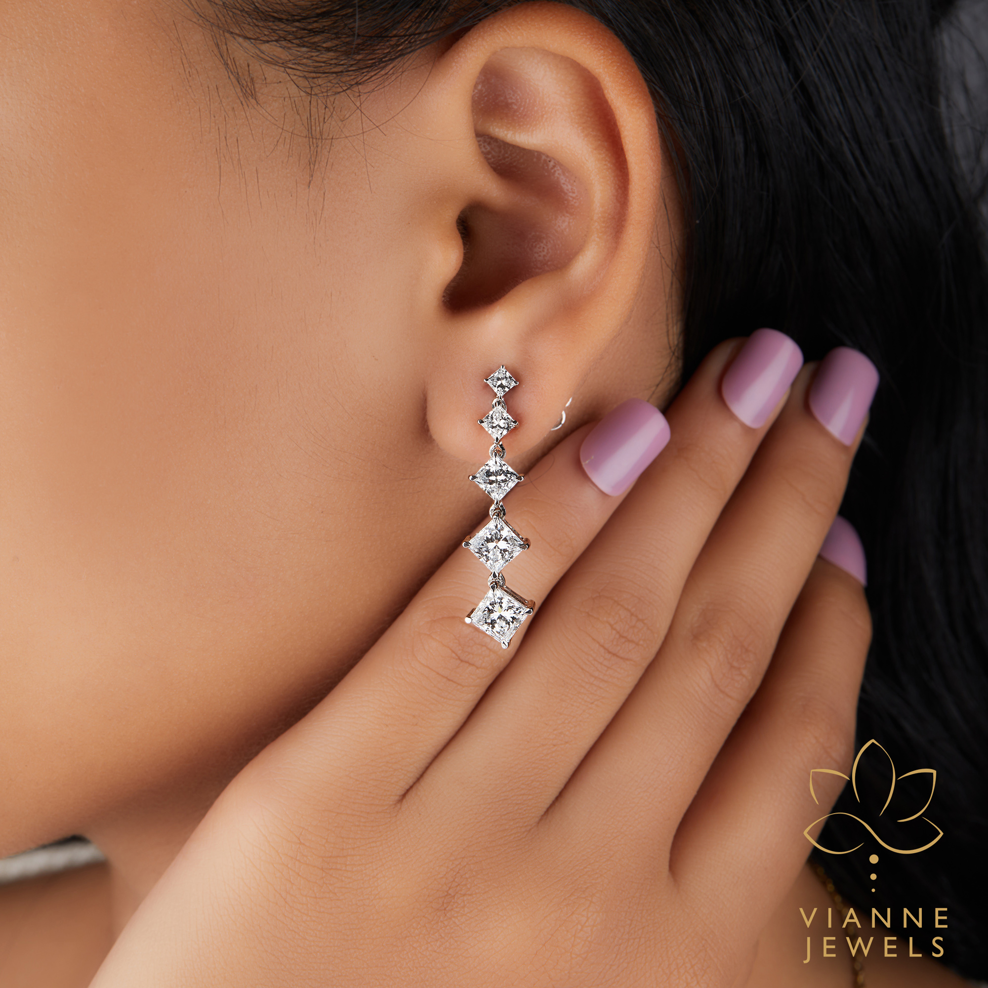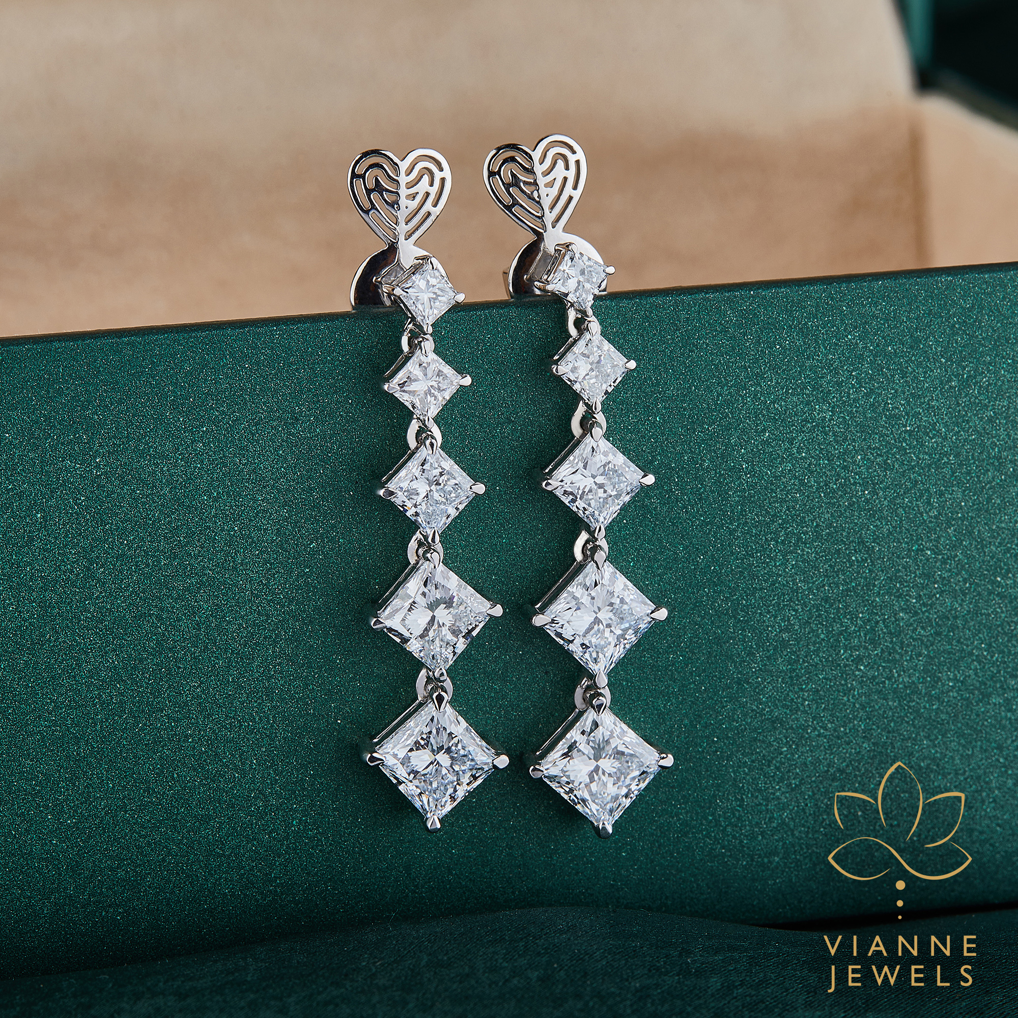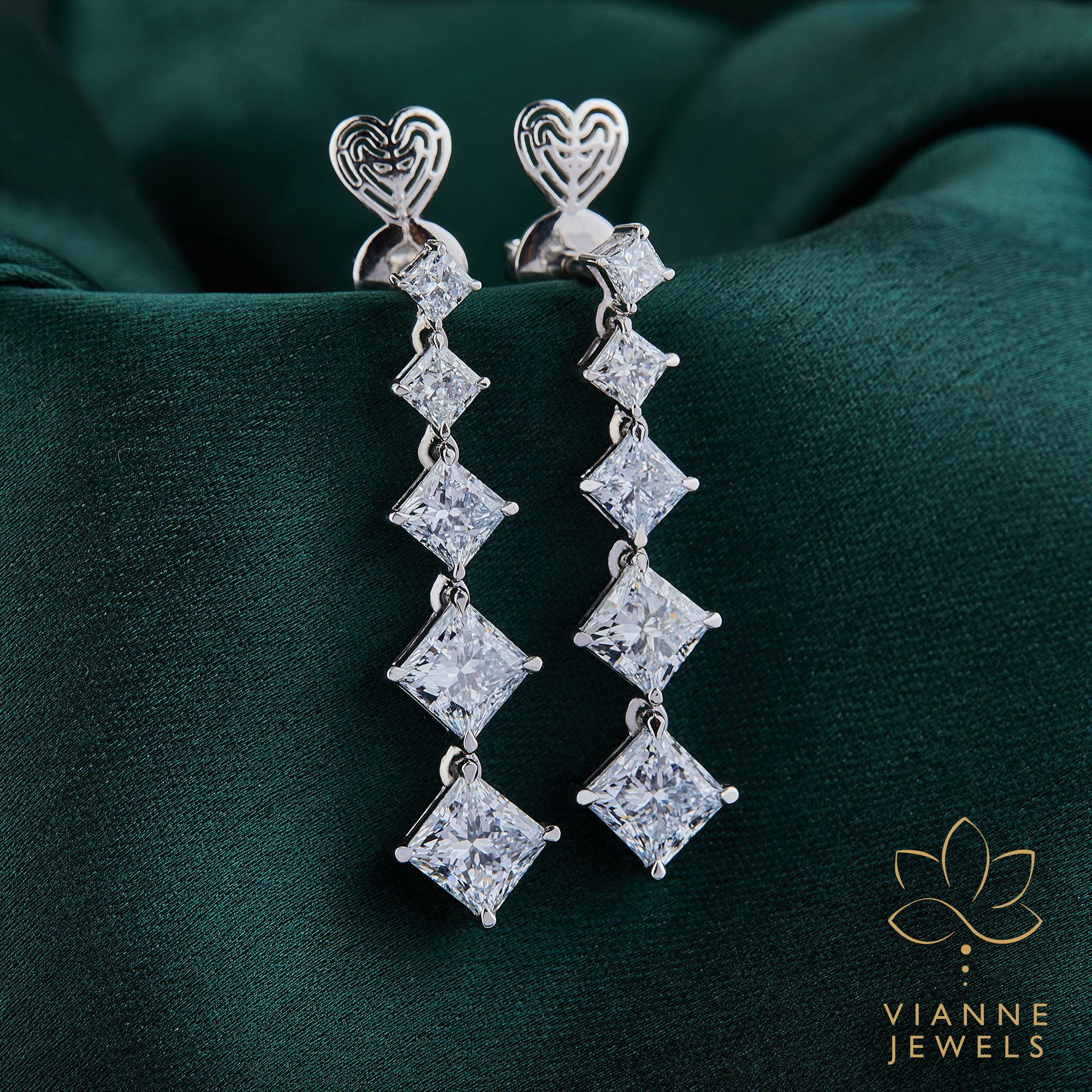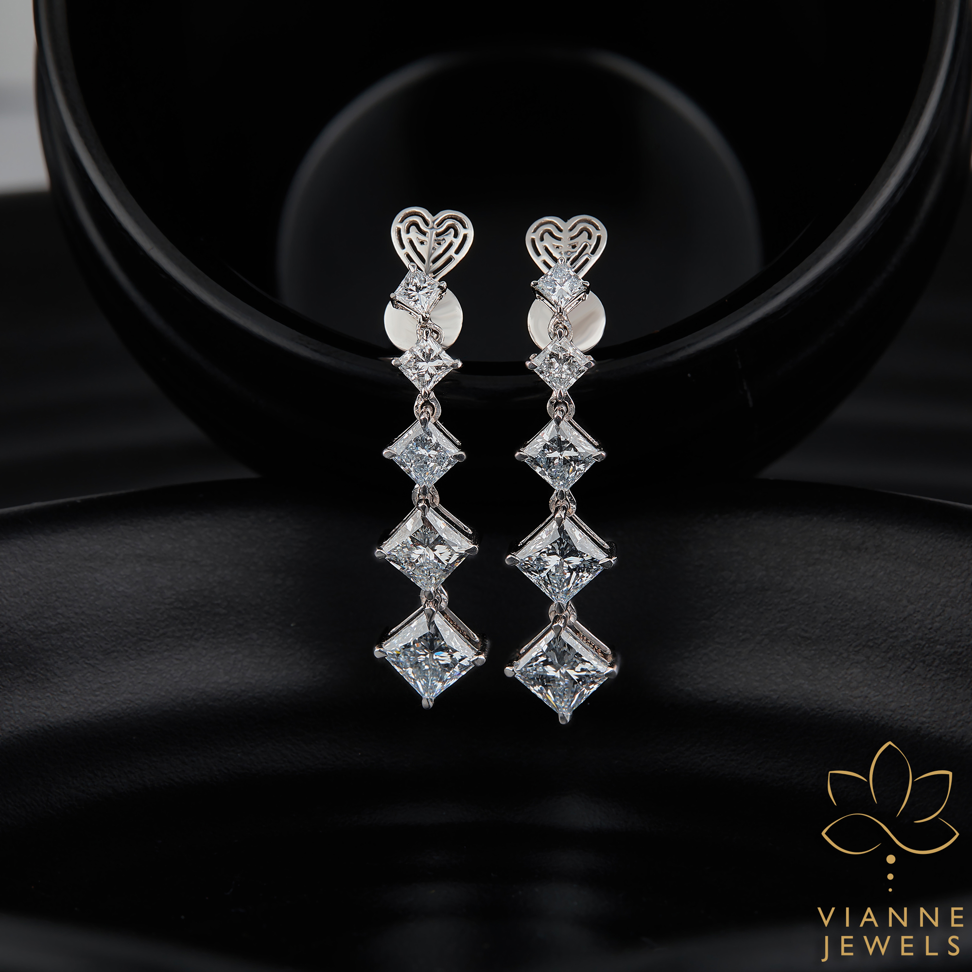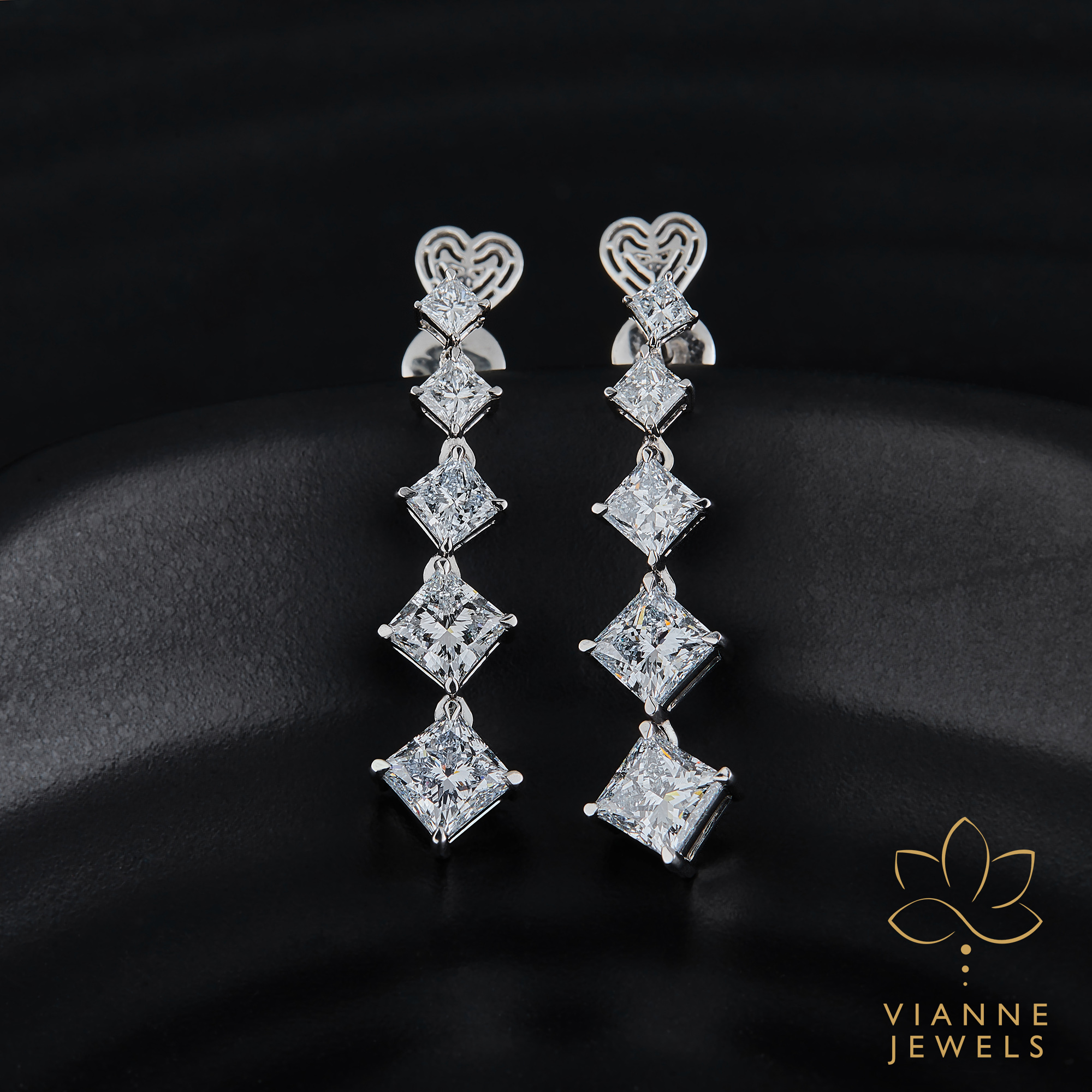 “Introducing the ‘Regal Cascade’ – a masterclass in refined grace and contemporary design. Each earring in this pair presents a breathtaking linear drop of princess-cut lab-grown diamonds, meticulously aligned to capture and reflect every ray of light. These diamonds are not only visually stunning but also a nod to ethical fashion, as they are created with the utmost respect for our planet.
