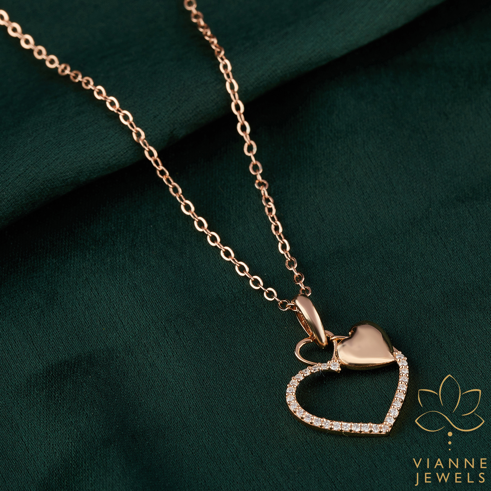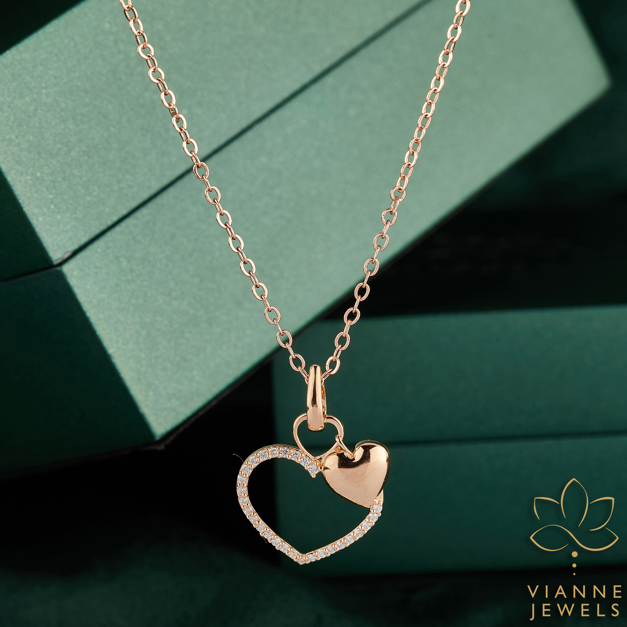 “Discover a symbol of love reimagined with the Rose Romance Pendant, an exquisite representation of affection and tenderness. This pendant features a harmonious blend of two hearts – one polished to a mirror finish, and the other adorned with a halo of lab-created diamonds that sparkle with every heartbeat.