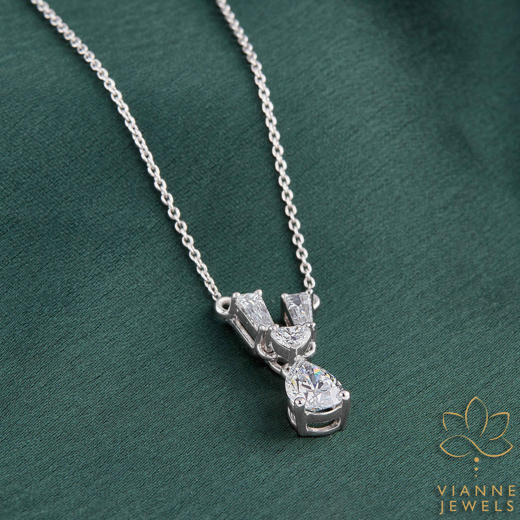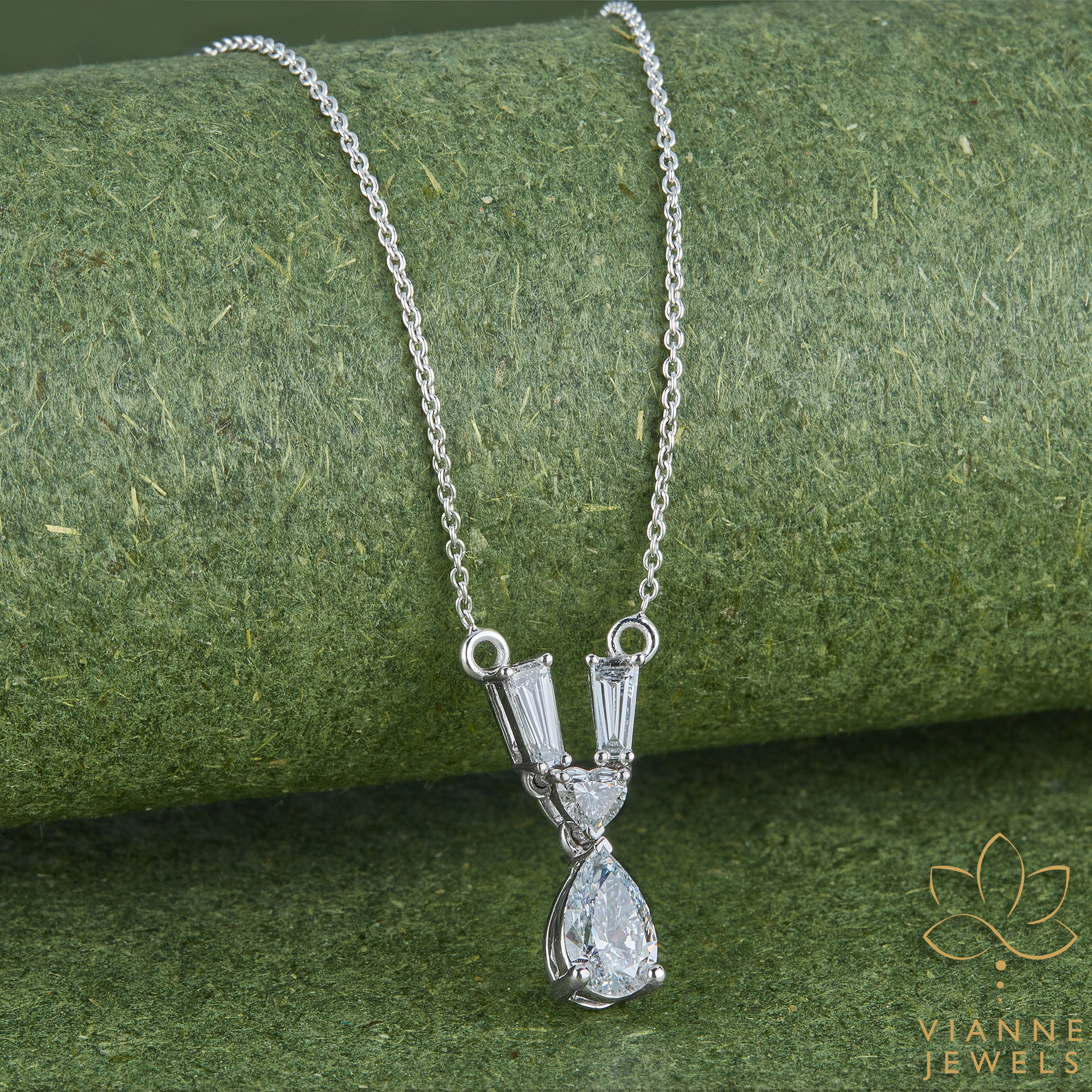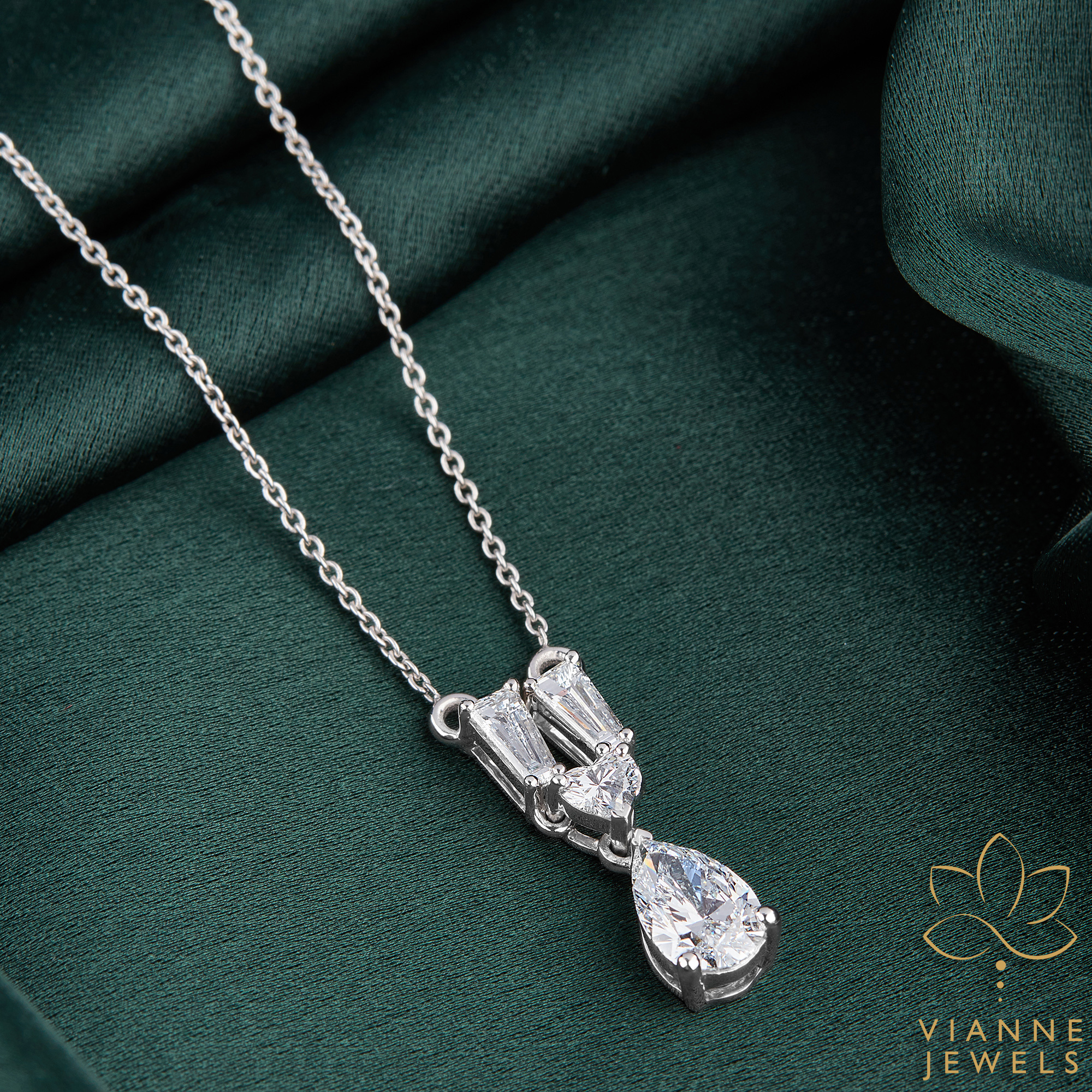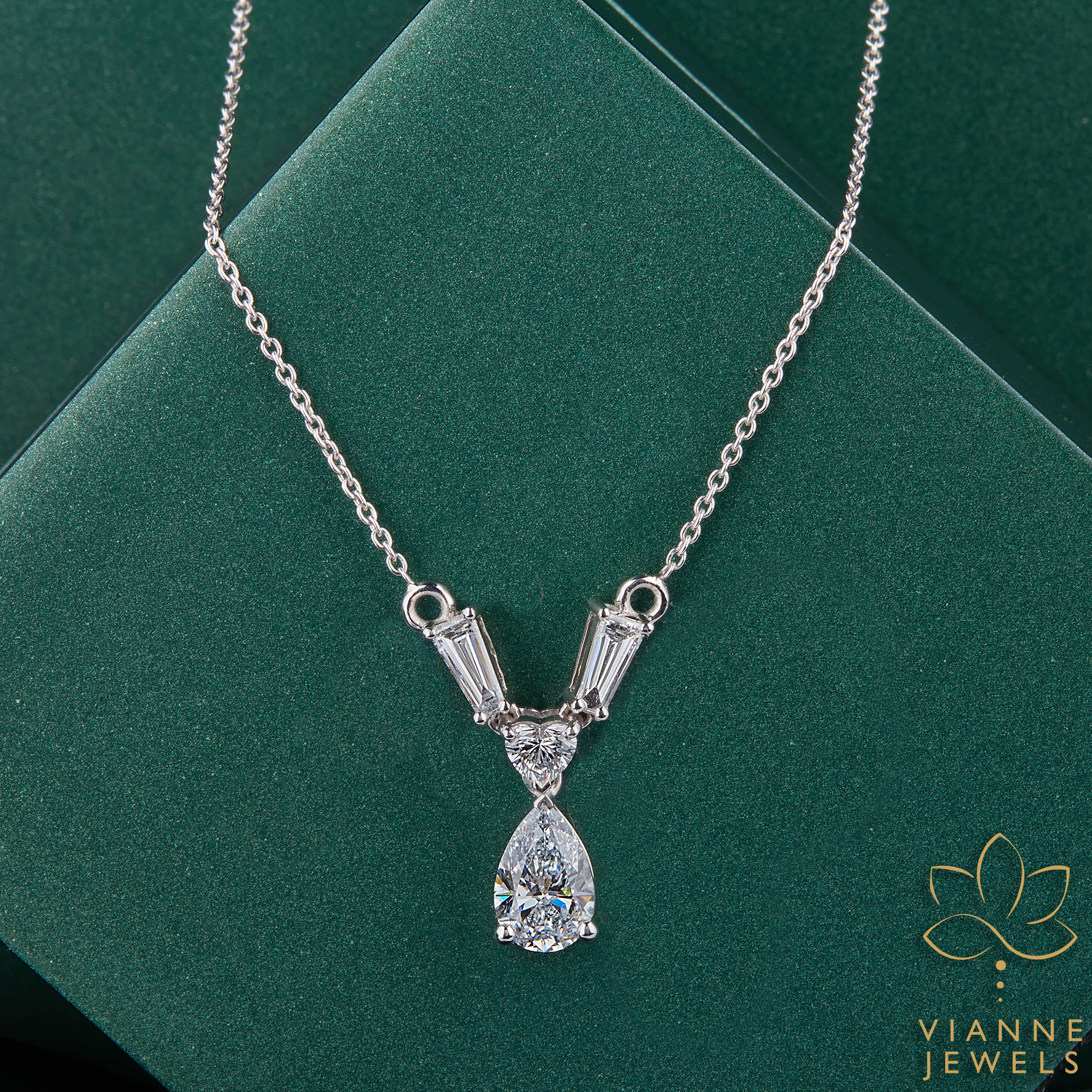 “The ‘Sophisticated Harmony’ pendant is a masterpiece of contemporary design fused with timeless elegance. At the heart of this piece lies a mesmerizing pear drop lab-grown diamond, known for its exceptional clarity and sustainable origin. Flanked by slender baguette diamonds in a vertical arrangement, the pendant exudes a unique charm that is both modern and chic.