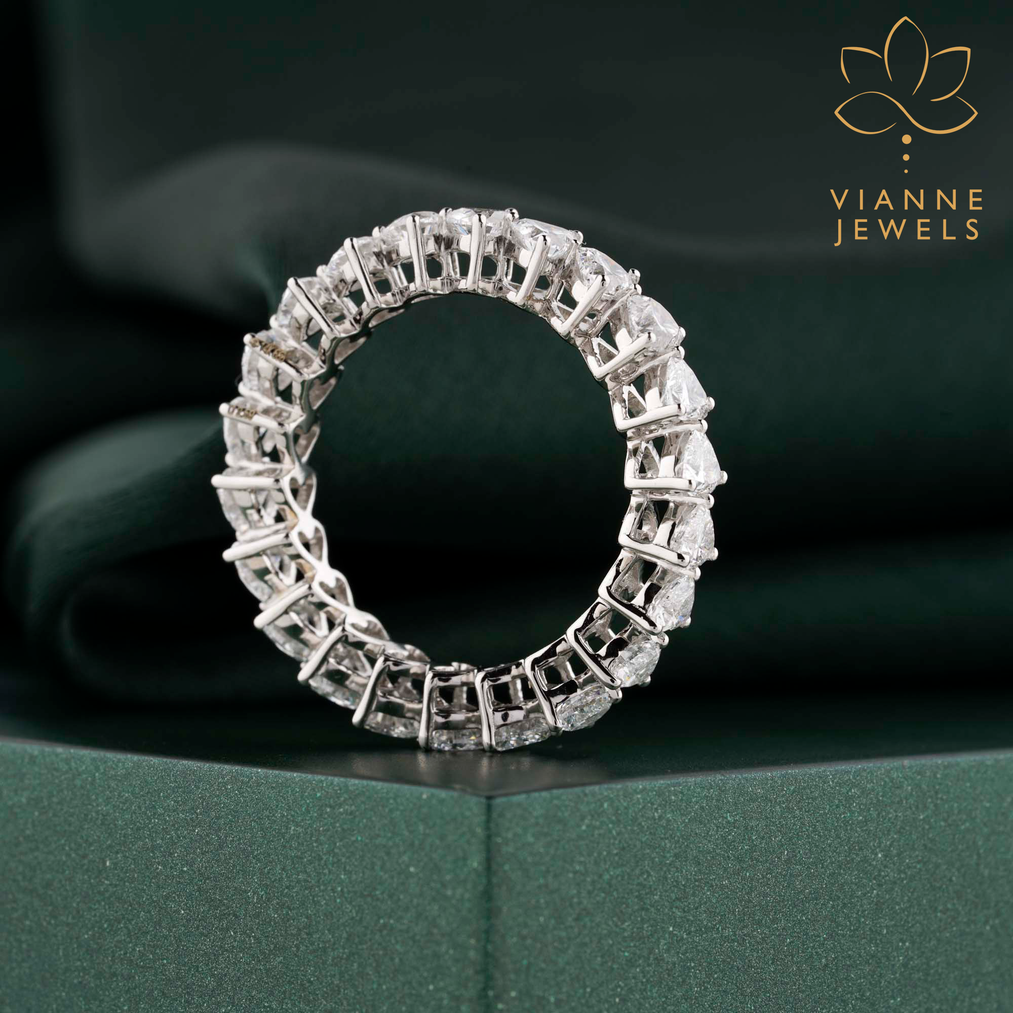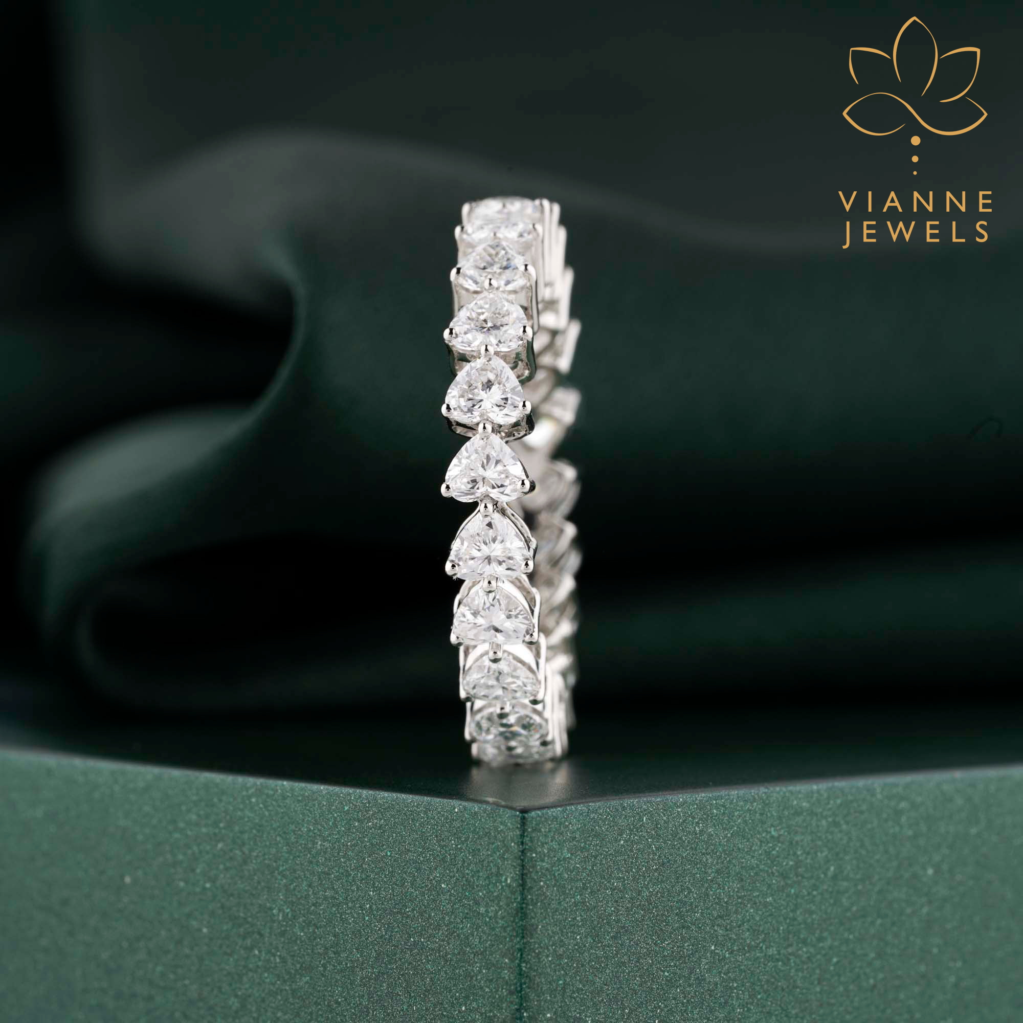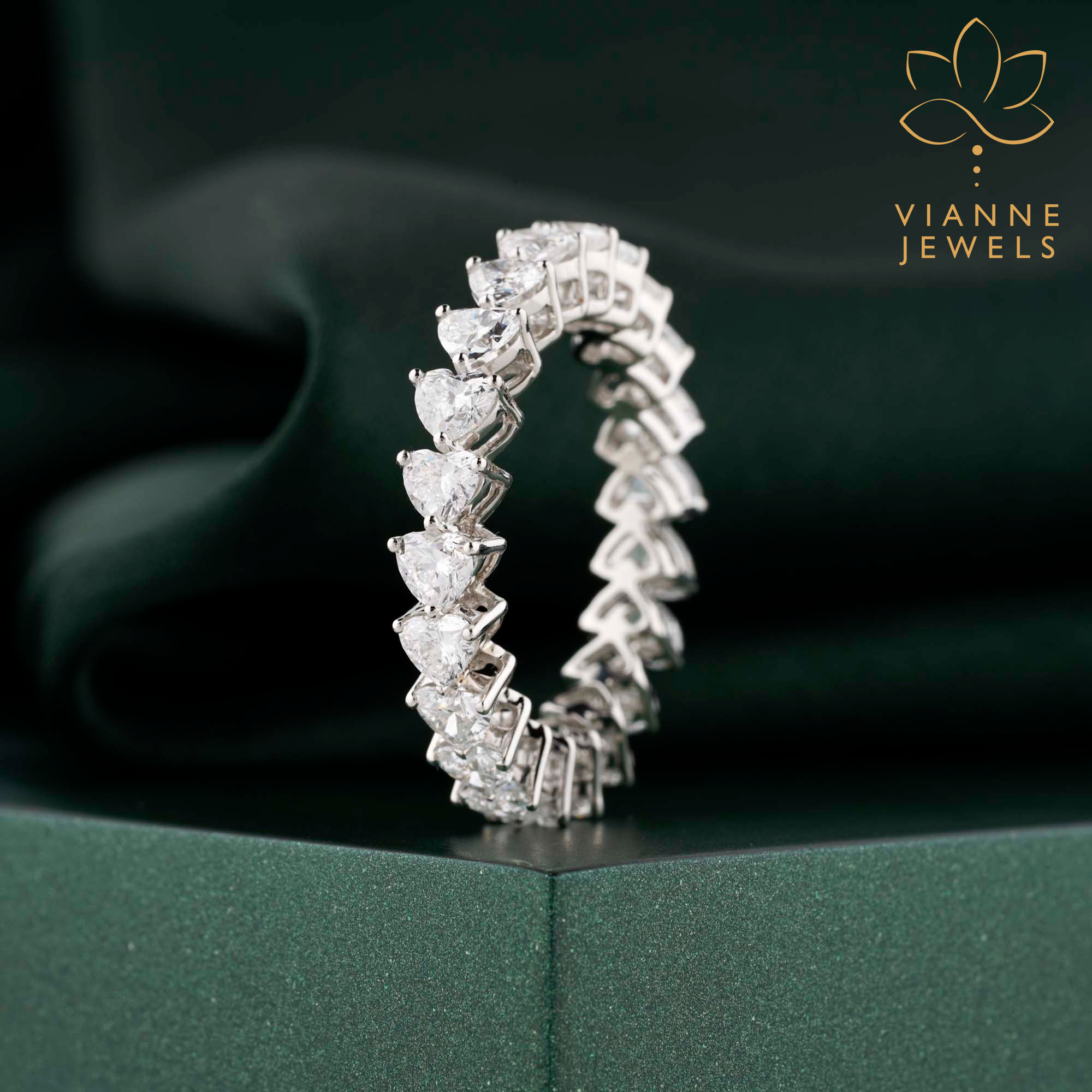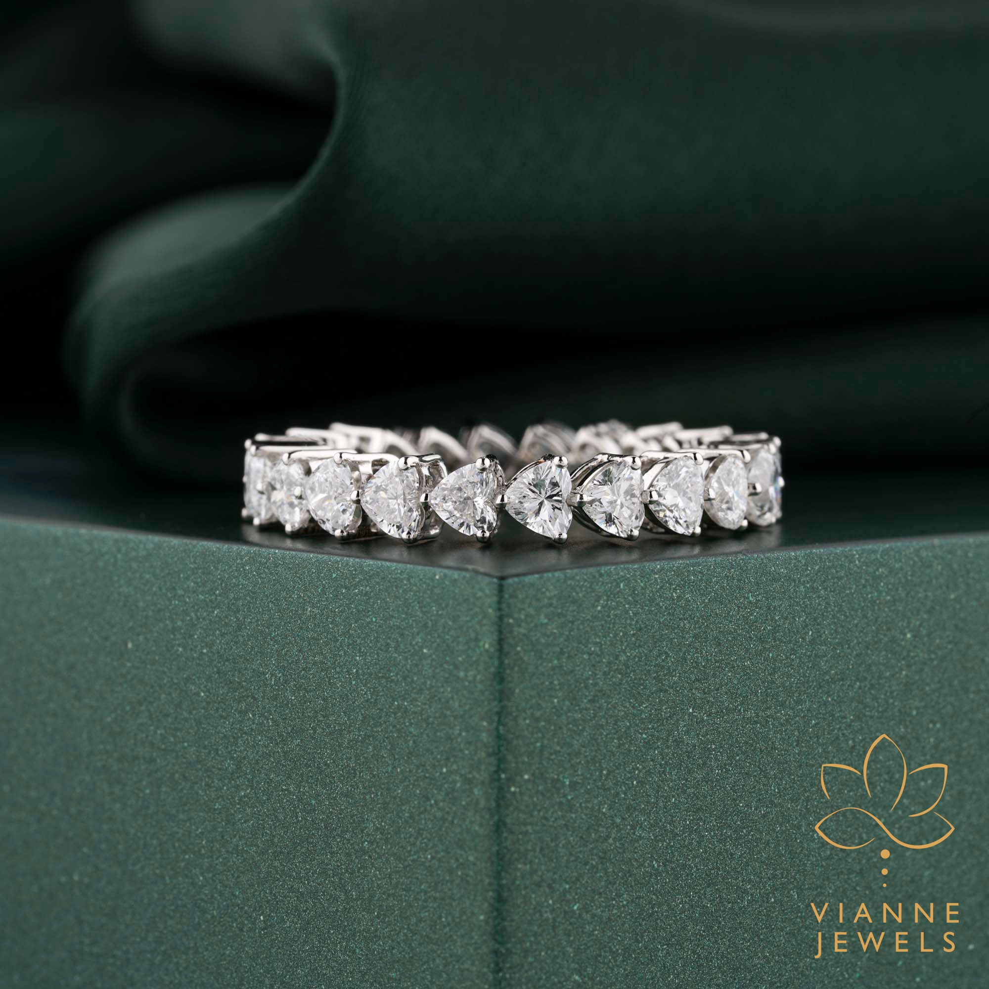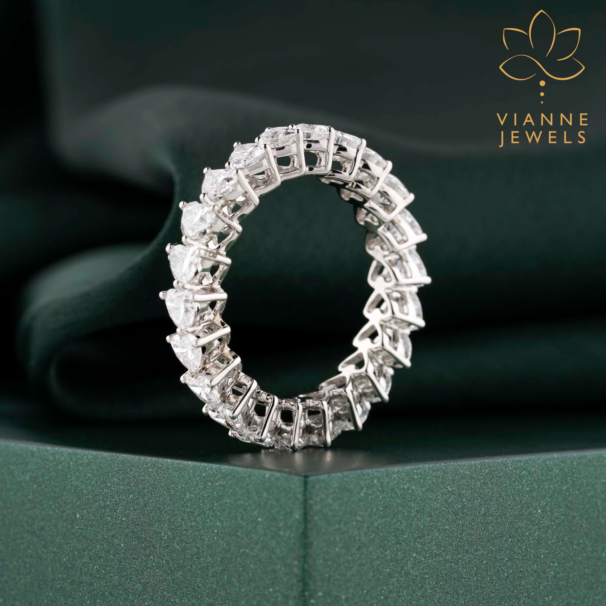 This eternity band is designed for those who appreciate the romance of the heart shape but desire the modernity and environmental consciousness of lab-grown diamonds. The white gold setting complements the clear brilliance of the diamonds, resulting in a piece that’s both striking and sophisticated.