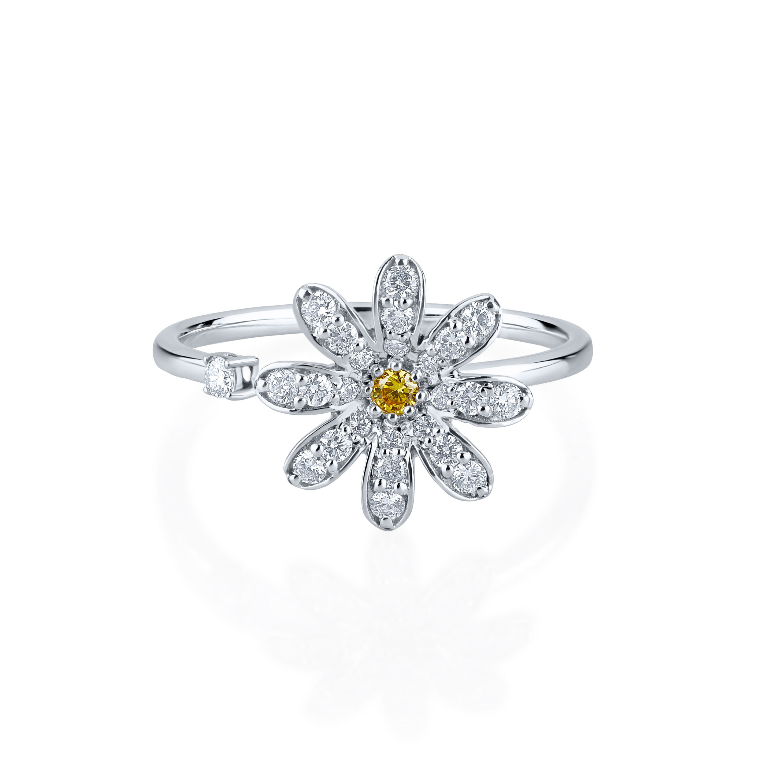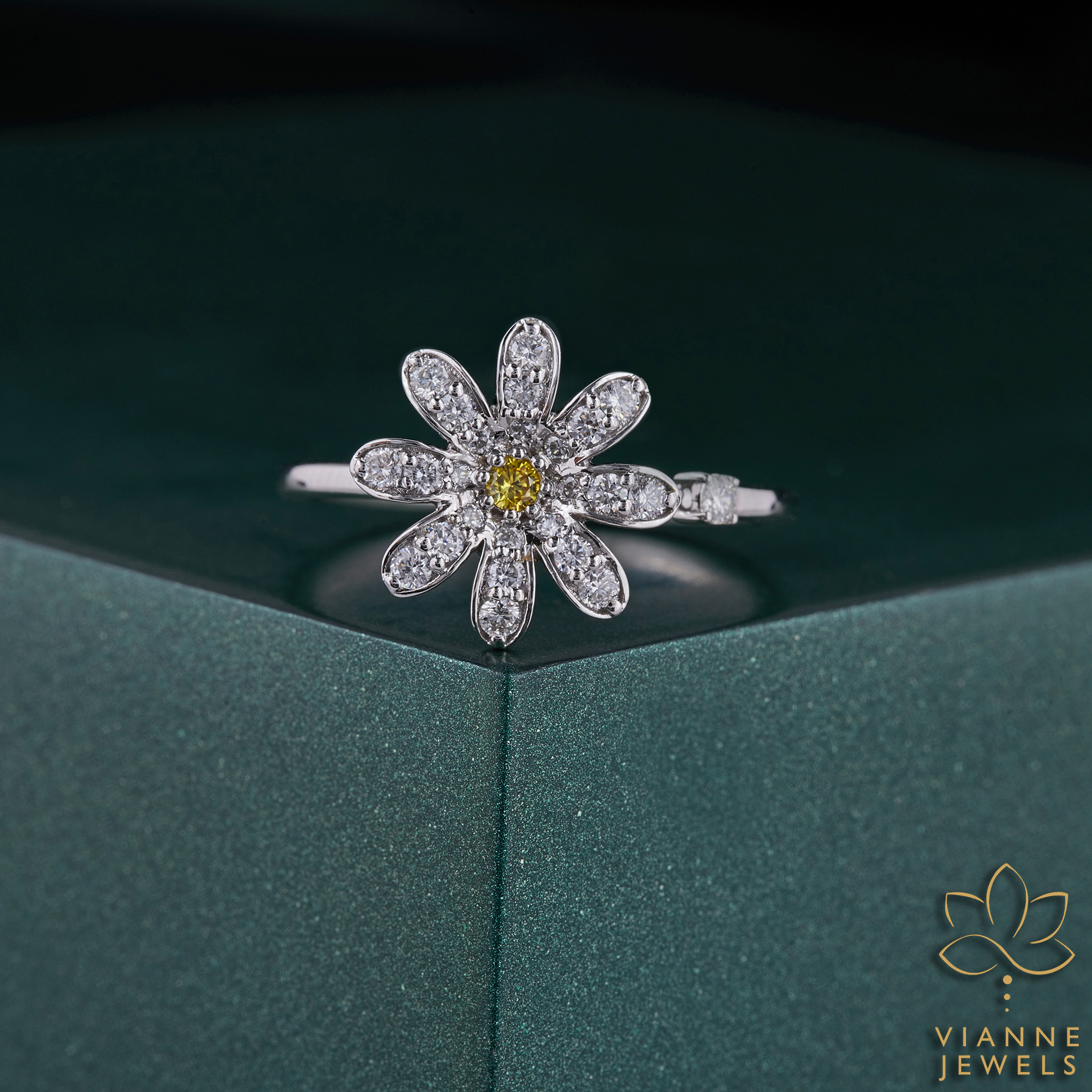 “Embrace the vibrancy of a springtime garden with our Sunshine Bloom Daisy Ring, a piece where modern craftsmanship meets nature-inspired charm. The heart of this enchanting flower is a sunny lab-grown yellow diamond, a gemstone known for its warmth and joyous hue. Surrounding this golden center are petals adorned with clear lab-grown diamonds, each meticulously set to capture and reflect every glimmer of light.