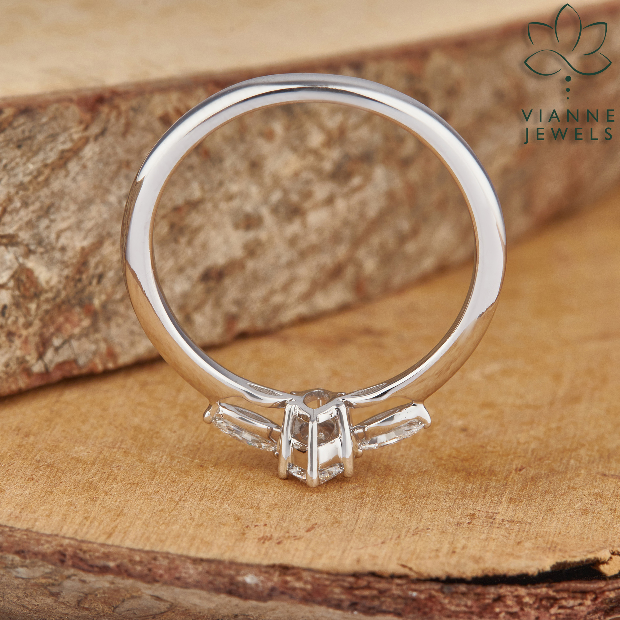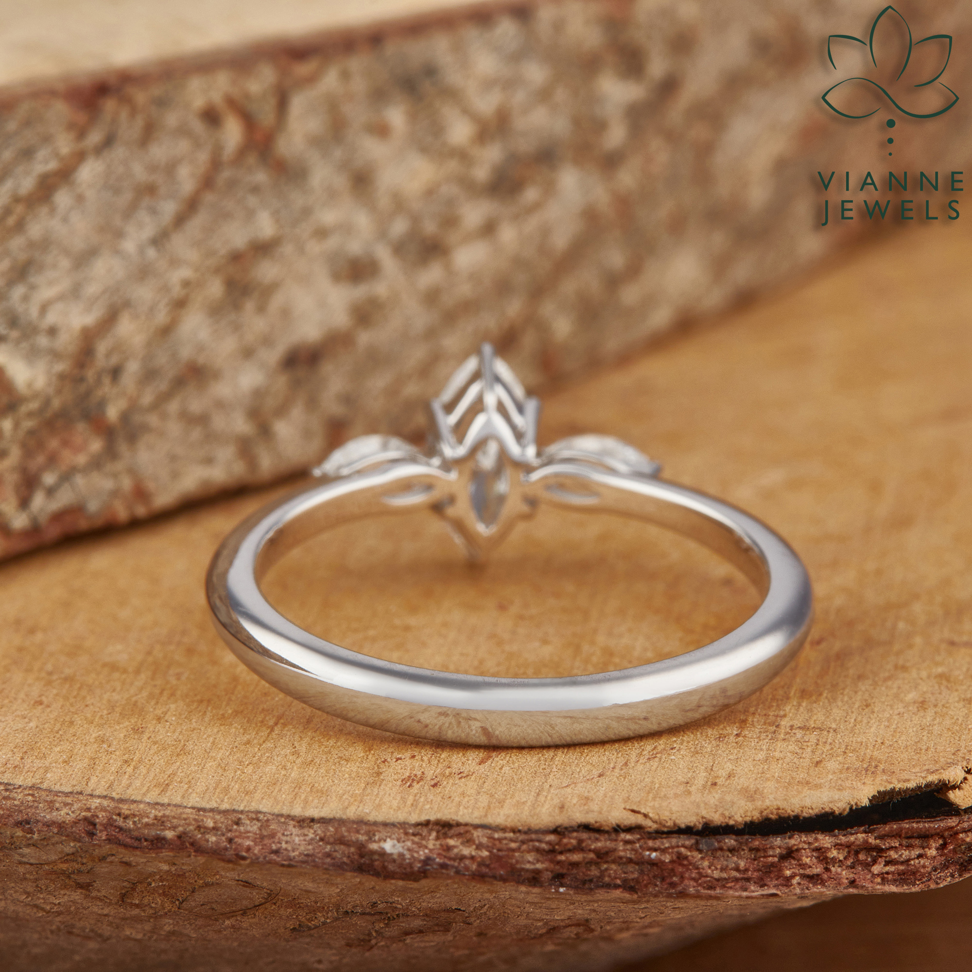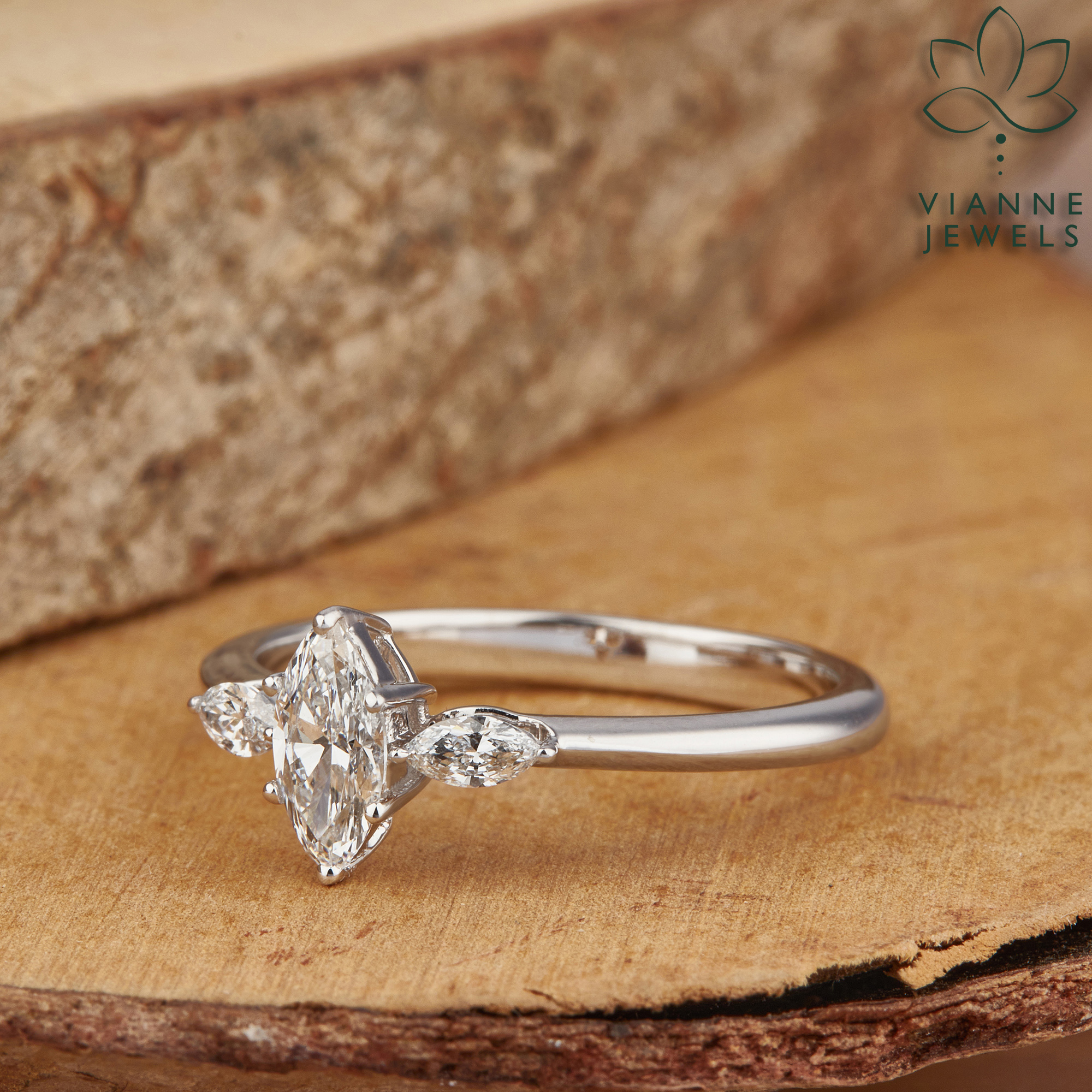 Our Symphony of Light Diamond Ring is a testament to timeless elegance with a modern twist. At the heart of this exquisite creation is a marquise-cut lab-grown diamond, its elongated shape and pointed ends creating a captivating display of light. This central gem is perfectly framed by two round brilliant-cut diamonds, adding a sparkling contrast to the refined silhouette.