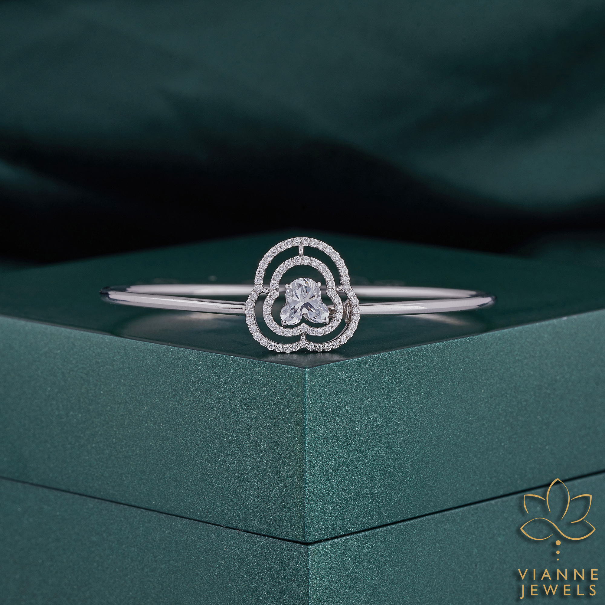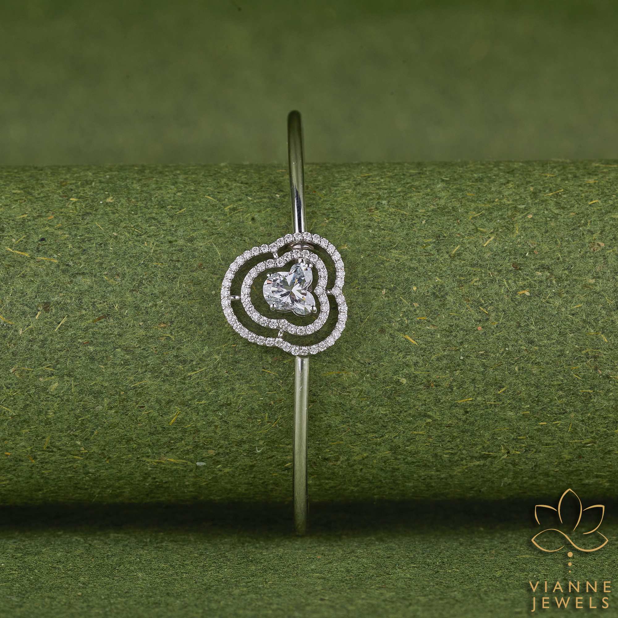 Each lab-grown diamond selected for this bangle mirrors the exceptional clarity and radiance of mined diamonds, while offering a more sustainable and ethical choice. The central motif is framed by concentric halos of diamonds, creating a dynamic interplay of light and shadow, and amplifying the visual impact of the central stone.