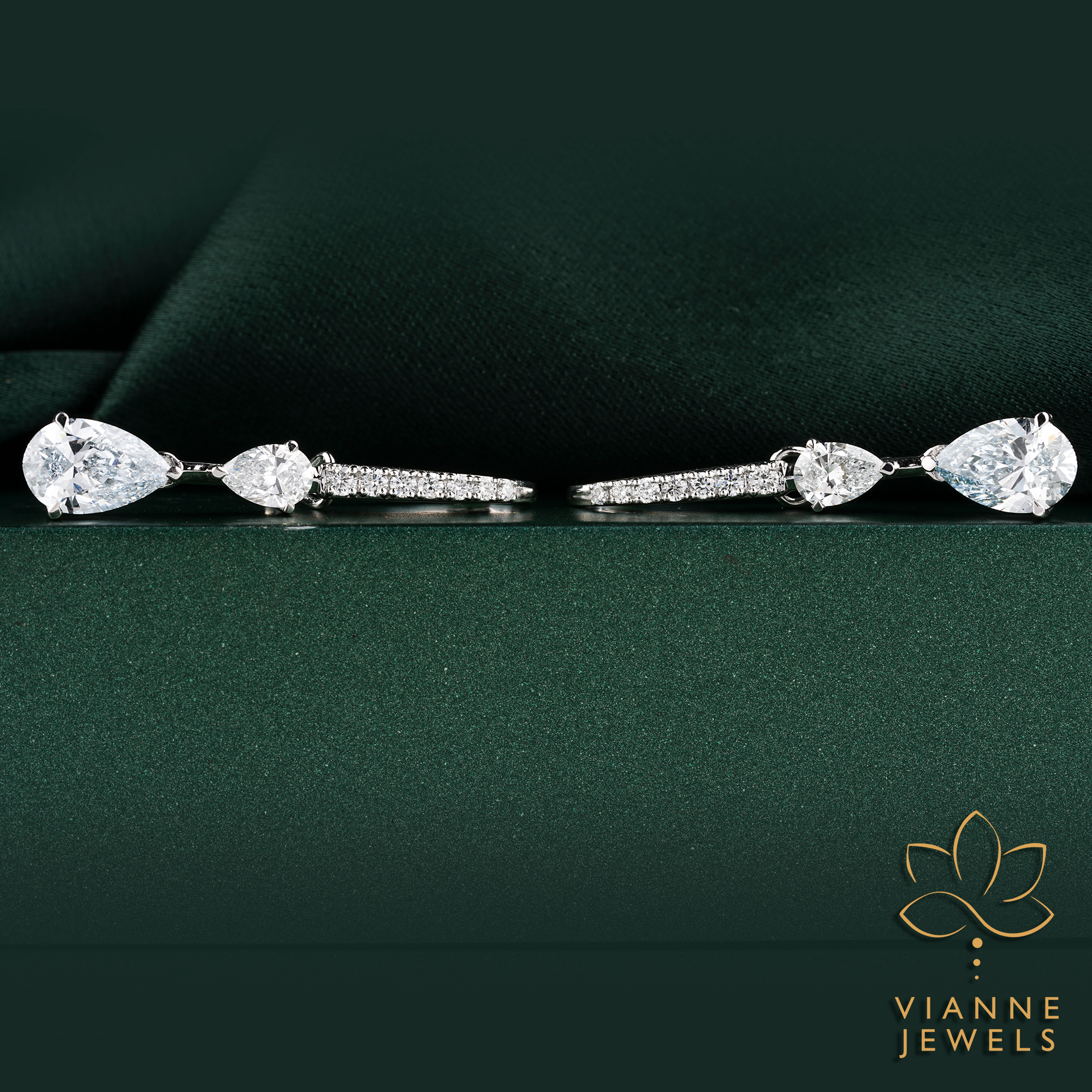 The heart-shaped diamond symbolizes love, while the teardrop below signifies emotion and depth, making these earrings a powerful statement of passion and elegance. The elongated column of pavé-set diamonds adds a glittering pathway that draws attention to the main stones, creating a striking visual harmony.