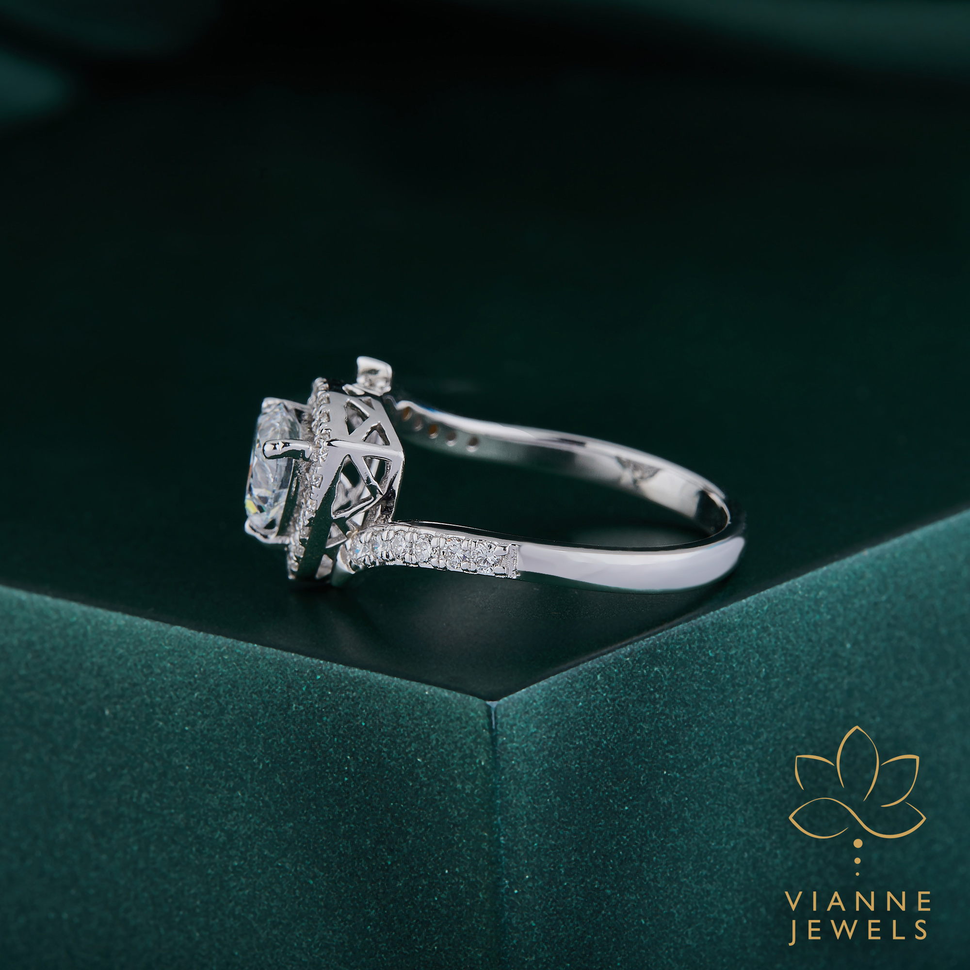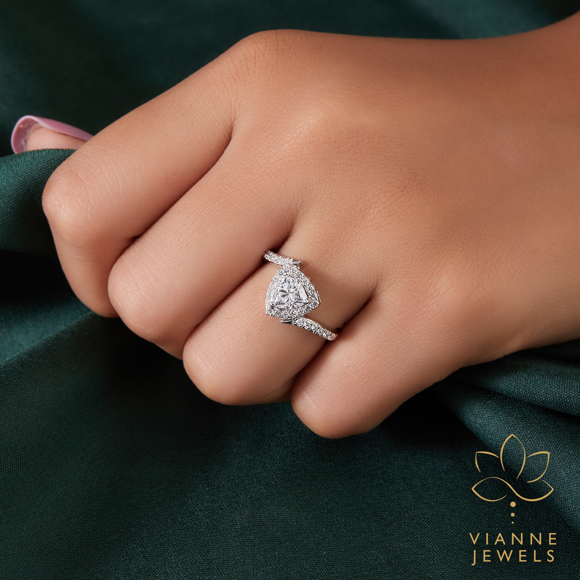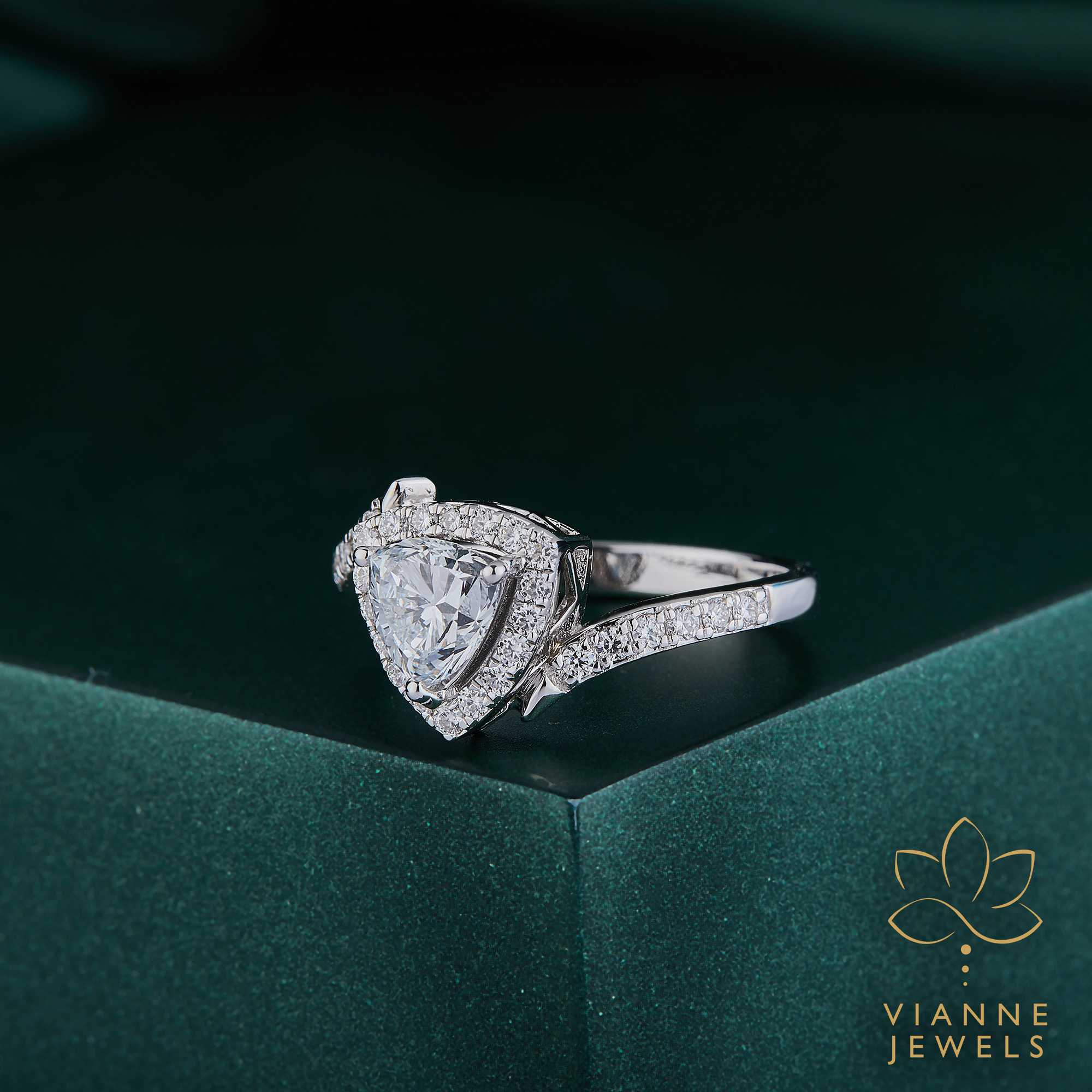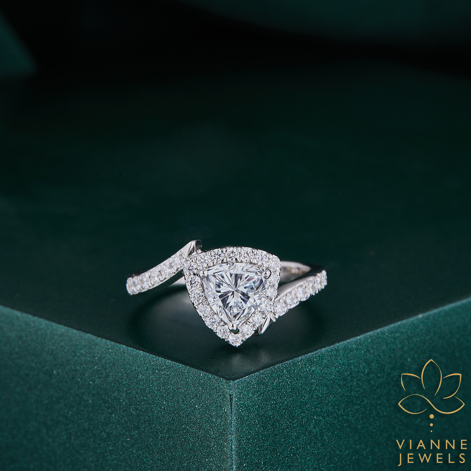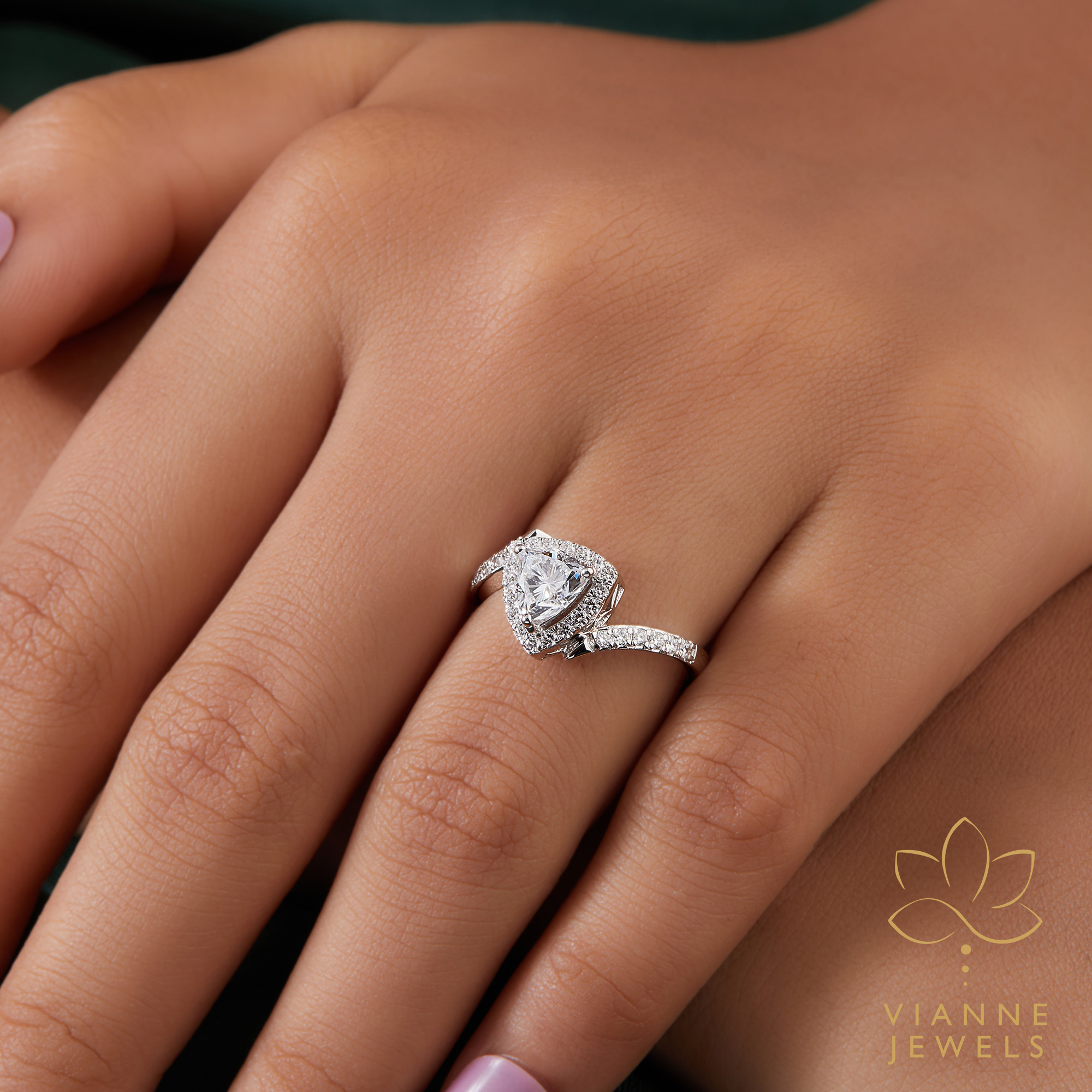 “Make a statement of love that is as bold and unique as your relationship with our ‘Trillion Triumph’ Engagement Ring. This breathtaking piece is centered around a spectacular trillion-cut lab-grown diamond, known for its sharp edges and contemporary appeal. The central stone is beautifully framed by a halo of sparkling pavé-set diamonds, which extend down the shoulders of the sleek white gold band, adding an extra layer of brilliance.
