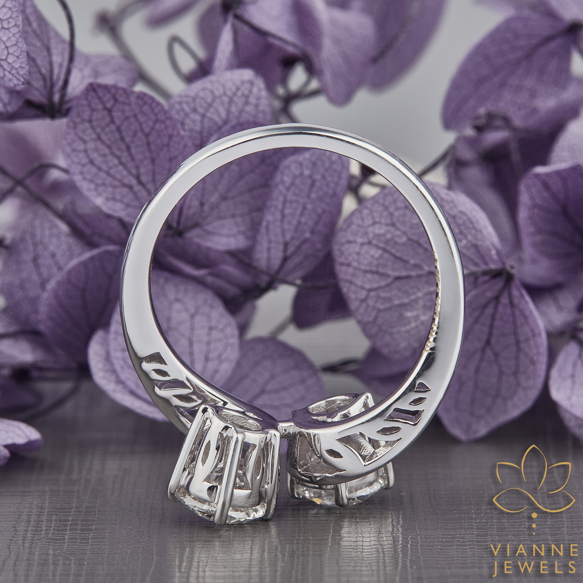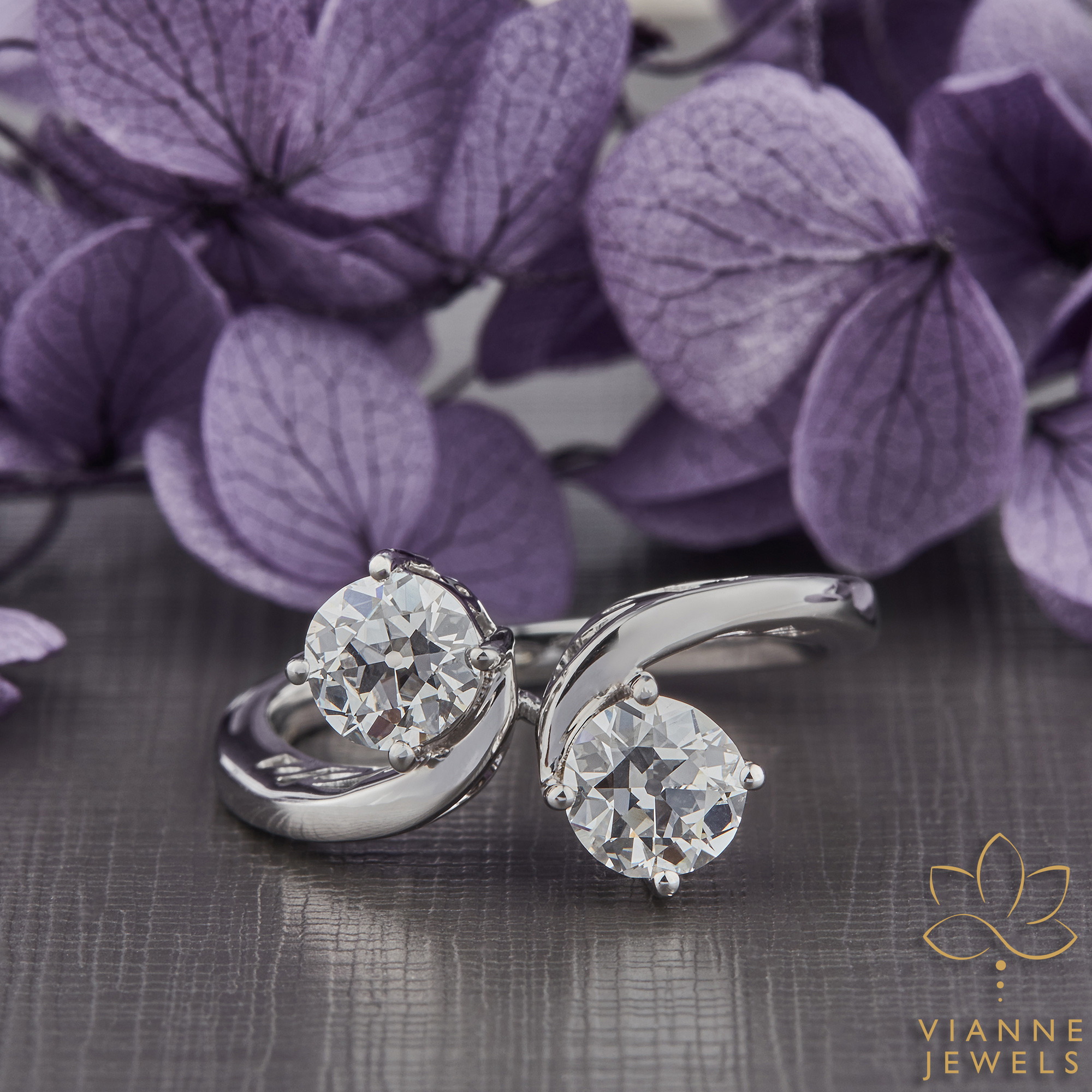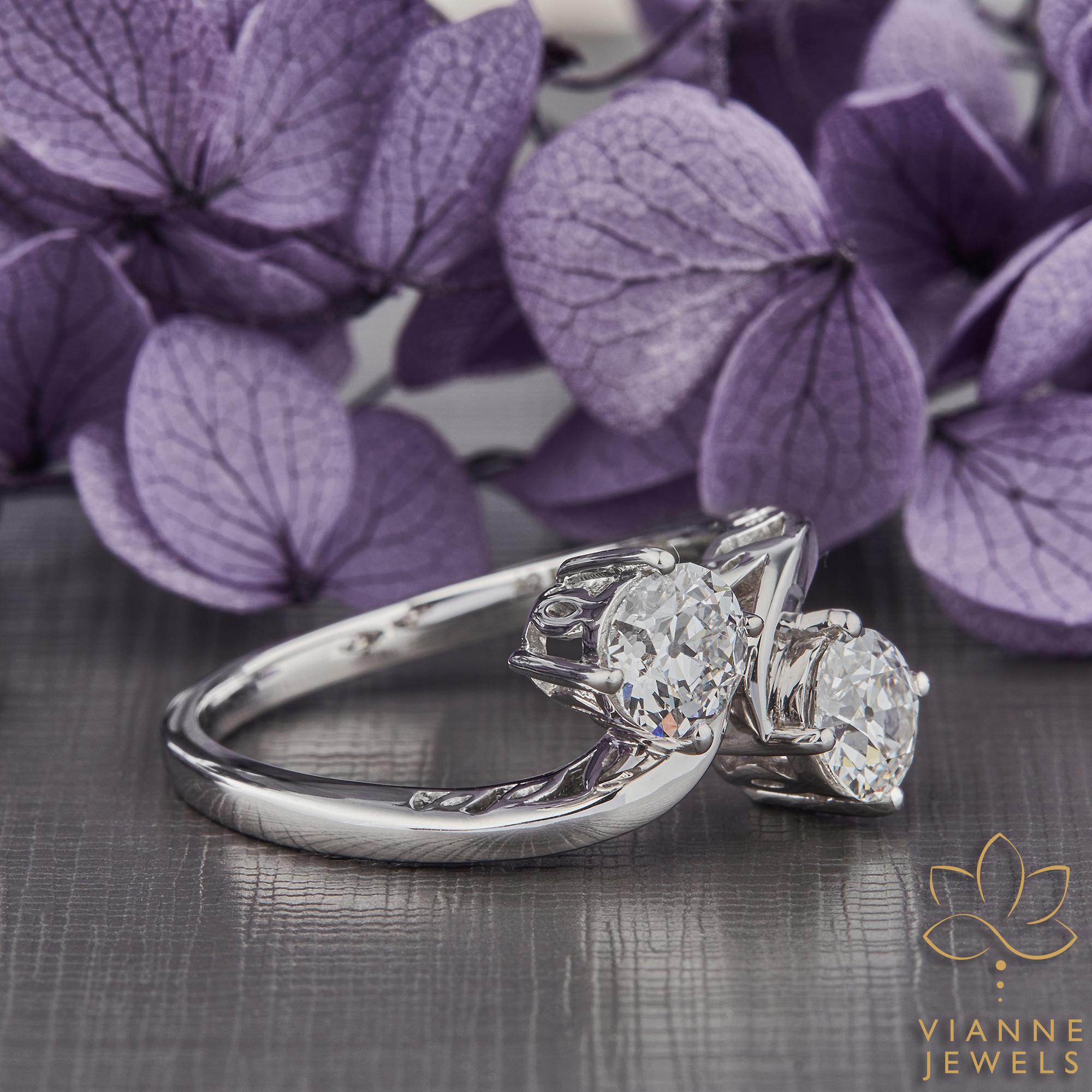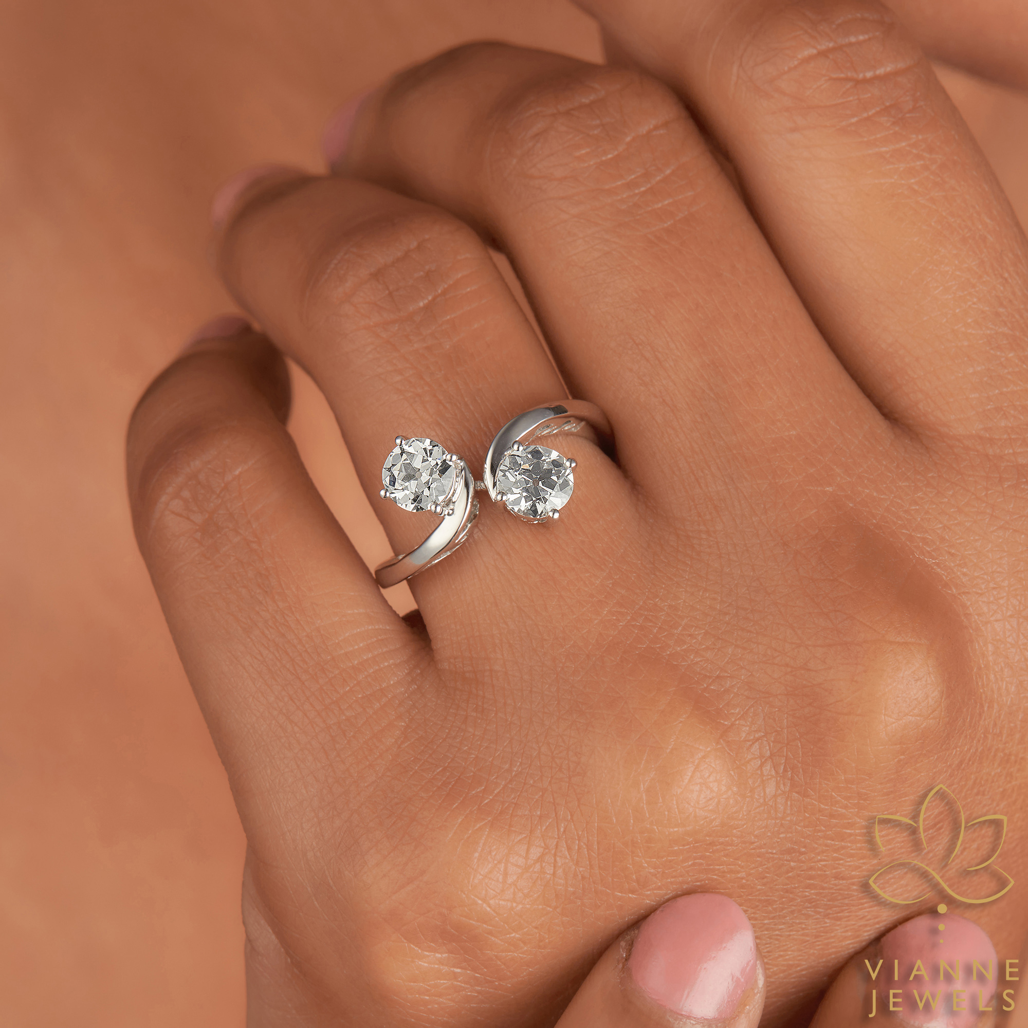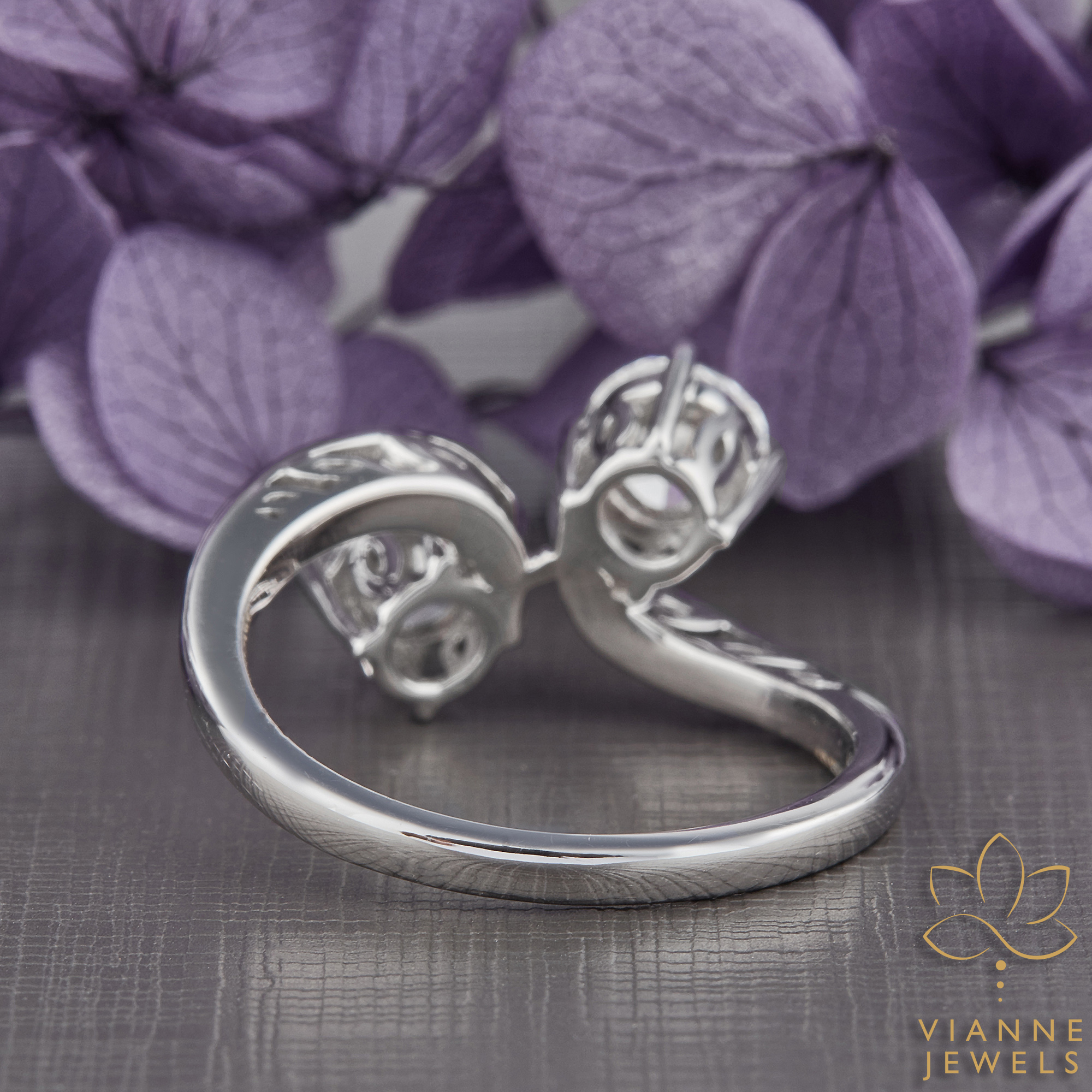 Delight in the contemporary elegance of our Unique Bypass Twin Diamond Ring, a signature offering from Vianne Jewels. This stunning piece features a graceful bypass design that holds two round-cut diamonds in a tender embrace.