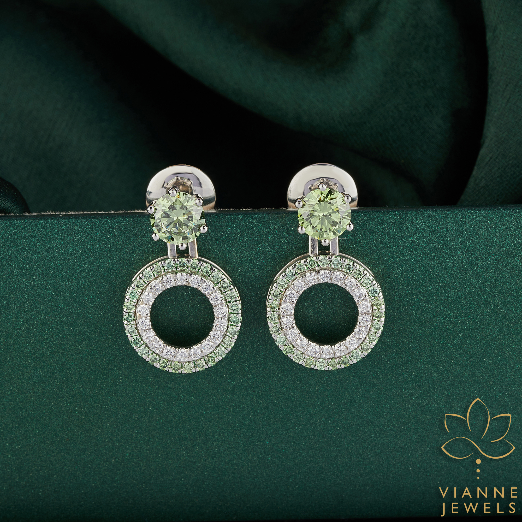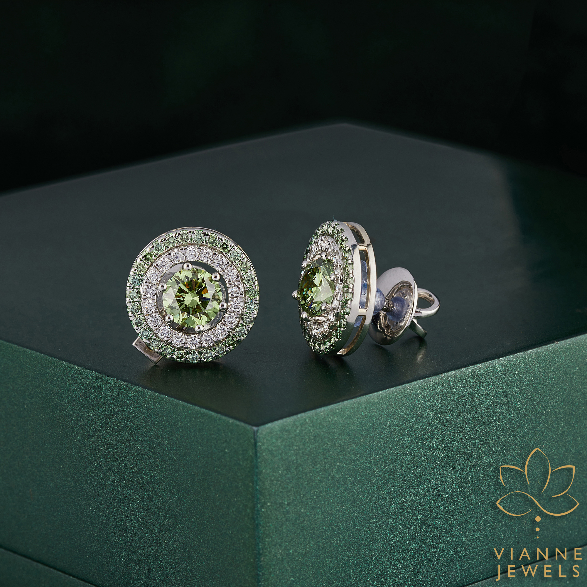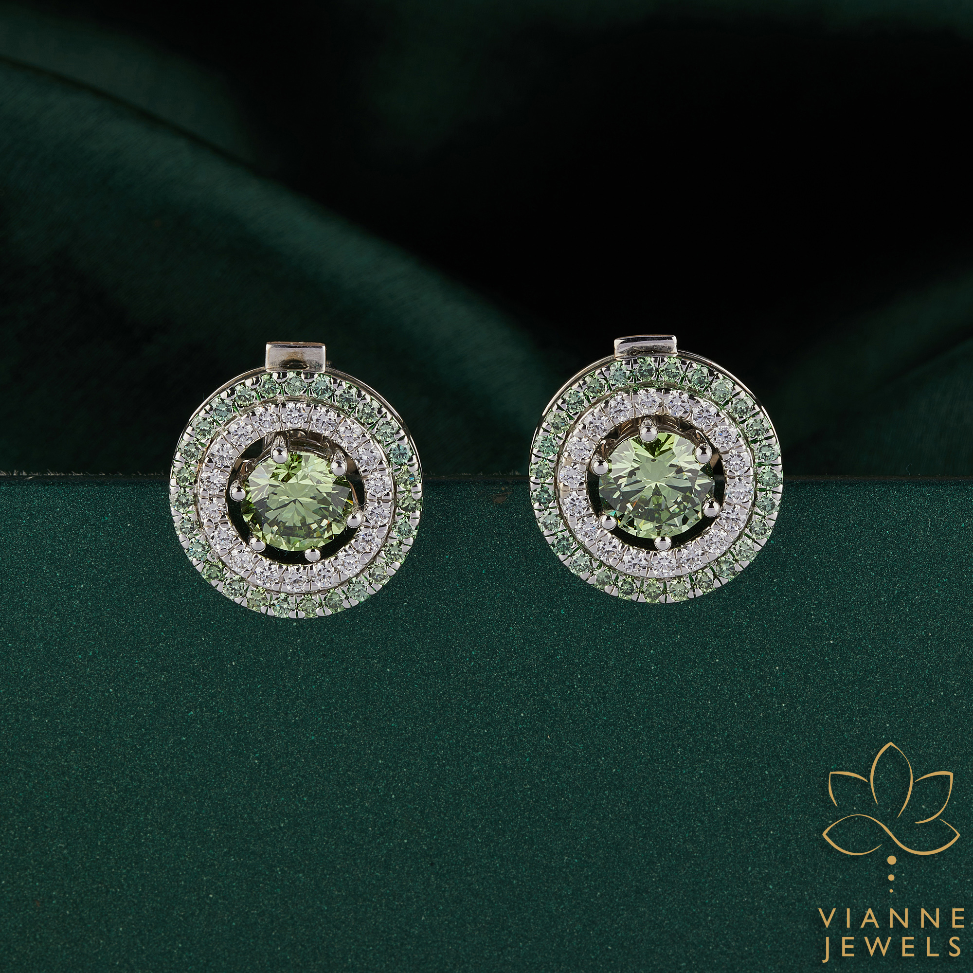 Encasing these mesmerizing gems, two concentric circles of lab-grown diamonds create an opulent halo effect, sparkling with every turn of your head. The outer halo features a bed of vibrant green diamonds that echo the central stone’s natural charm, while the inner halo dazzles with clear diamonds, adding an irresistible brilliance.